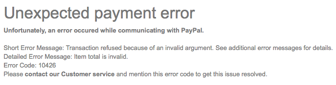 wrequine Posted November 18, 2015 Share Posted November 18, 2015 modify this file /modules/paypalusa/controllers/front/expresscheckout.php wrap any variable that is cast as float with number_format() example change (float)$product['price_wt'] to number_format((float)$product['price_wt'],2) I just started getting 10426 errors in my shop, too. Customers were using Paypal, but then this error appeared out of thin air. Wish I knew what sparked this change, but this fixed the problem - THANK YOU!! Link to comment Share on other sites More sharing options...