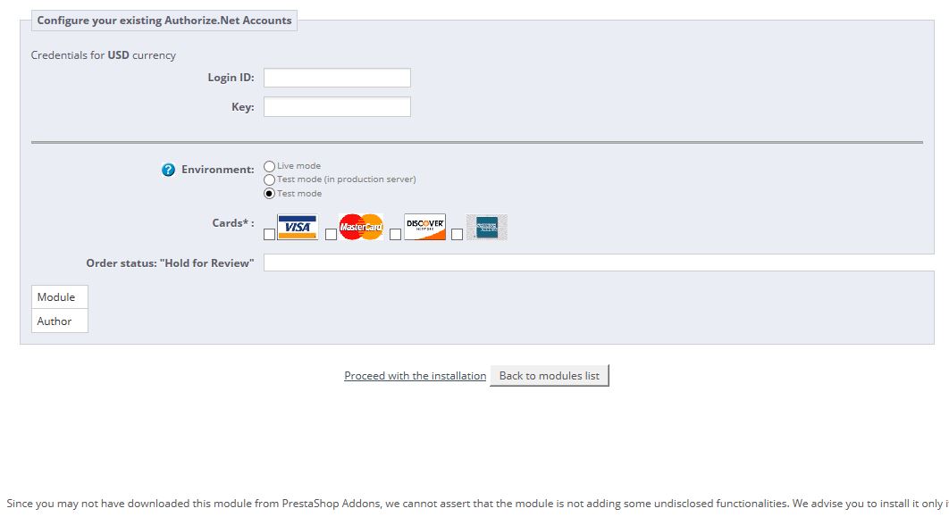 WebbCreations Posted February 1, 2015 Share Posted February 1, 2015 Hello, I already have the codes I need to configure Authorize.net, however the UPDATE SETTINGS button will not appear. Instead, there is a message at the bottom of the screen that says, "Since you may not have downloaded this module from PrestaShop Addons, we cannot assert that the module is not adding some undisclosed functionalities. We advise you to install it only if you trust the source of the content." The only option I have is "Proceed with the Installation" or "Back to Modules List" (but the proceed doesn't work) I have done the following: Uninstalled, downloaded from PrestaShop Addons, reinstalled, updated Deleted, downloaded from PrestaShop Addons, reinstalled, updated No luck so far. I have attached an image of the screen. Any idea why it thinks I did't get the file from the Addon's shop? Even though it's labeled OFFICIAL in the Module List? Thanks in advance, WC Link to comment Share on other sites More sharing options...