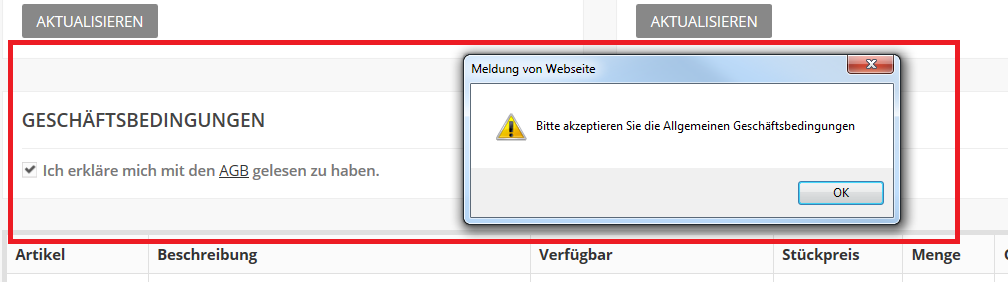 NZUMW Posted February 6, 2015 Share Posted February 6, 2015 (edited) Hi, wir stehen kurz vor dem Ziel und wollten heute ein paar Bestellungen, Gutschriften etc. durchspielen. Es wäre fast zu schön wenn etwas mal reibungslos Ablaufen würde. Wir erhalten die Fehlermeldung "Bitte akzeptieren Sie die AGB" beim klick auf kaufen. Jedoch ist der Haken gesetzt. Trotz mehrmaligen rumprobieren keine Lösung in Sicht. Wenn wir EU-legal deaktivieren funktioniert die Bestellabwicklung. (AGB wird einen Schritt früher abgefragt) Anbei ein Screenshot. Kann uns jemand helfen? Man beachte auch den gut übersetzten Satz. Wie kann man den anpassen? *Edit: Ich glaube ich habe ins falsche Forum gepostet. Falls nötig bitte verschieben* Edited February 6, 2015 by NZUMW (see edit history) Link to comment Share on other sites More sharing options...