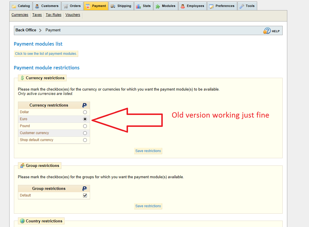doekia Posted February 9, 2015 Share Posted February 9, 2015 (edited) @PC33, I have a strange feeling that due the upgrade some table such as module_currency did not get populated properly. Do you have the knowledge to check such? If not pv me so I'll access your database and try to figure out what happened. And I disagree with some other comments, a lot of people do remember how those beauty such as PS 1.3, 1.4 and 1.5 worked. Also double check that on "modules > payment", the various currencies are ticked on the restriction panel. The panel is just below the commercial advertisement flood about Addons modules and before the group restriction panel. Best Edited February 9, 2015 by doekia (see edit history) Link to comment Share on other sites More sharing options...