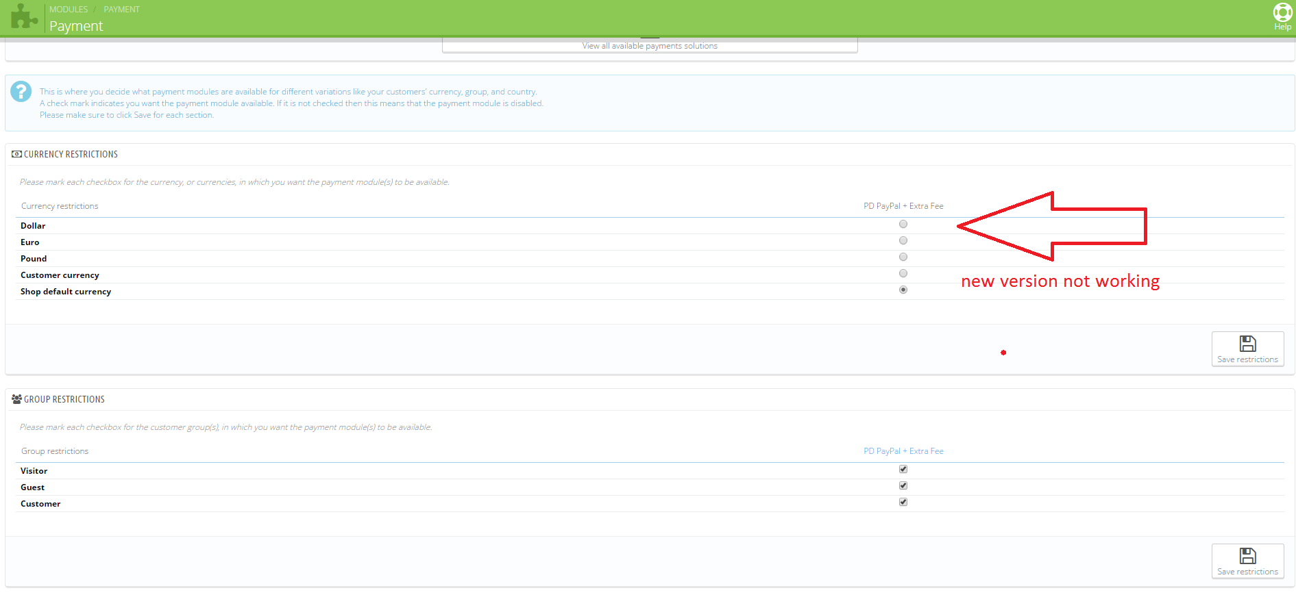 PC33 Posted February 7, 2015 Share Posted February 7, 2015 Hello everyone, i hope i can explain this right so that some one can help me. On my old Prestashop version 1.4.0.9 on Payment tab, i was able to force the customer paying only in USD in case i needed for. Basically i just selected USD and then all checkouts would be finished in USD currency, from paypal express checkout or normal checkout with Paypal. Now with the new version 1.6 everytime i pick the option USD only, on the checkout it says "no payment modules have been installed", ive been looking arround but no solution so far, not to mention that i only use Paypal as payment method. In the other hand if i select on payment the option "customer currency" it works, but i realy dont want this option because mostly we use EUR as currency and USD only when we need some USD balance. Can anyone help me with this, do i need to setup a new carrier or anything like that? Thank you all Kind Regards Link to comment Share on other sites More sharing options...
