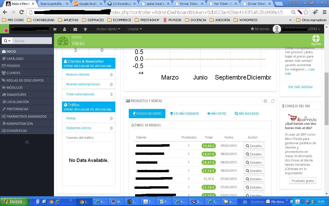 ldlopez Posted February 9, 2015 Share Posted February 9, 2015 Hola, hace dos días he configurado y me he dado de alta en analitycs. He instalado ambos módulos en prestashop 1.6.0.11 y me ha conectado bien. El problema es que en el backoffice no me muestra las estadísticas de analitycs. He probado mil cosas y no hay manera. Pone DATA NO AVAILABLE. Tengo que hacer algo más para que se muestren las estadísticas en mi backoffice? Adjunto captura de pantalla. Link to comment Share on other sites More sharing options...