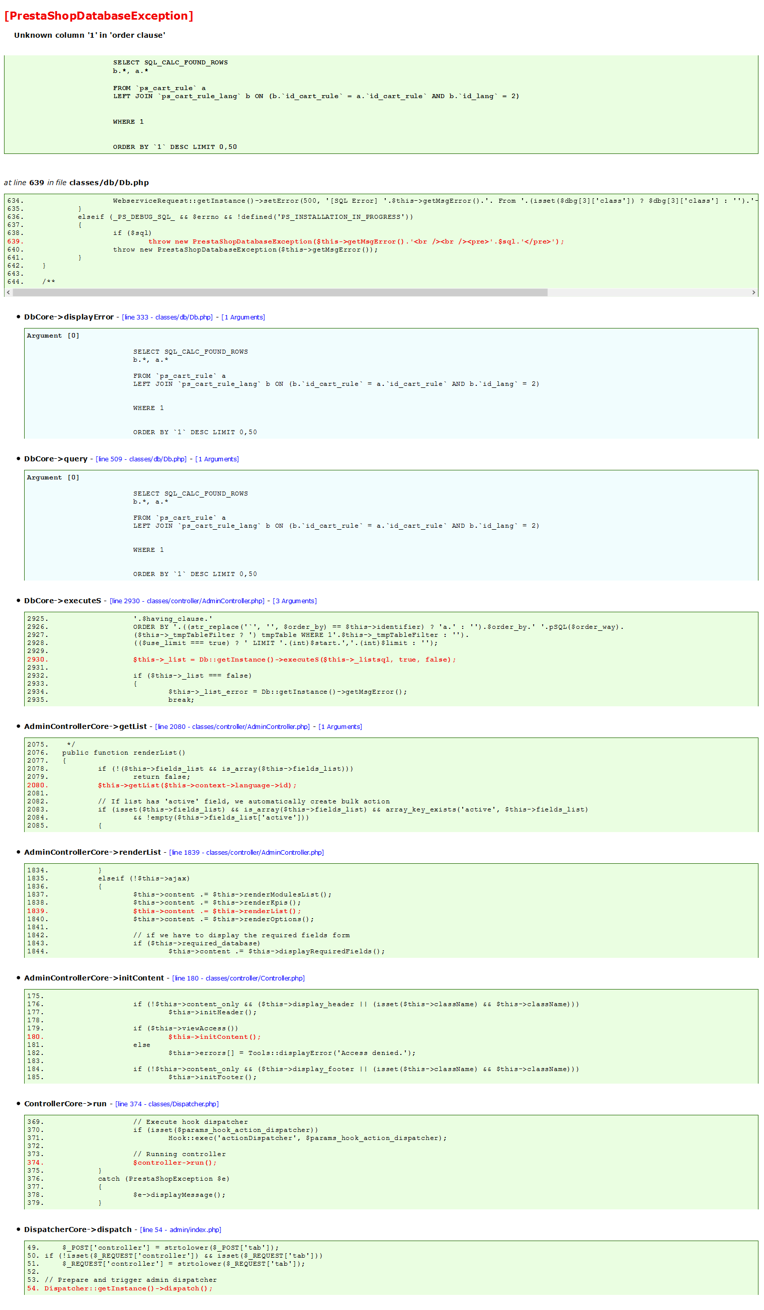 rymcimcim Posted February 10, 2015 Share Posted February 10, 2015 Hello On some subpages in backoffice I get the message about bad sql query: Unknown column '1' in 'order clause'. I can not create / register a new user, I can not modify some products. I turned on the dev mode and what I saw is in attachments. I also added more screenshots from the database tables: ps_cart_rule and ps_cart_rule_lang. I think that this is an error of the structure of one of these tables. I hope that this will help locate the problem Link to comment Share on other sites More sharing options...