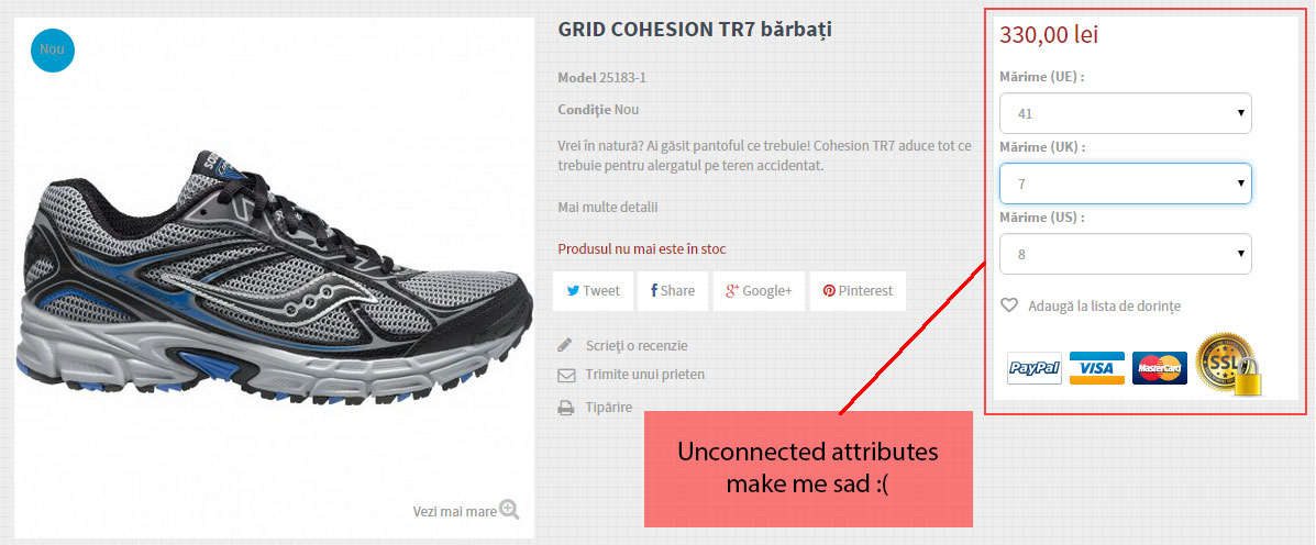 szaszati Posted February 11, 2015 Share Posted February 11, 2015 (edited) Hello, I am setting up a shoestore with Prestashop 1.6.0.9 and I have a problem regarding attributes. The different products are available in different sizes, which are configured in product attributes, but the client would like to have US, UK and EU sizes displayed as well. Currently, these three are set up as three different attributes, and I have created combinations so that for example a shoe's 41 EU, 8 US and 7 UK sizes make up a combination. The problem is, that all three attribute selectors appear on the product page, and the user can select them individually - of course there is an error message when the three selectors are not aligned like in one of the combinations, but this does not make very much sense. The ideal would be to set it up in a way, so that when the user selects the 41 EU size, the 8 US and 7 UK sizes are automaticcaly displayed, as they are directly connected, and no other selection is possible. I think that creating a single attribute (size) with values like '41 EU / 8 US / 7 UK' would be a solution, but I hope there is something more "elegant". It would be ok if only one size (the EU size for example) would be selectable, and when the user selects an available size, the other two are only displayed, and there is no dropdown selector for them. Any ideas? Edited February 11, 2015 by szaszati (see edit history) Link to comment Share on other sites More sharing options...