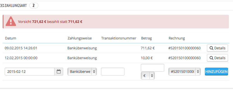 Stevn204 Posted February 20, 2015 Author Share Posted February 20, 2015 In der Bestellungsansicht eines Kunden. Aber ich habe es nun so gelöst, dass ich die Bestellung ausgelöscht und neu angelegt habe. Link to comment Share on other sites More sharing options...