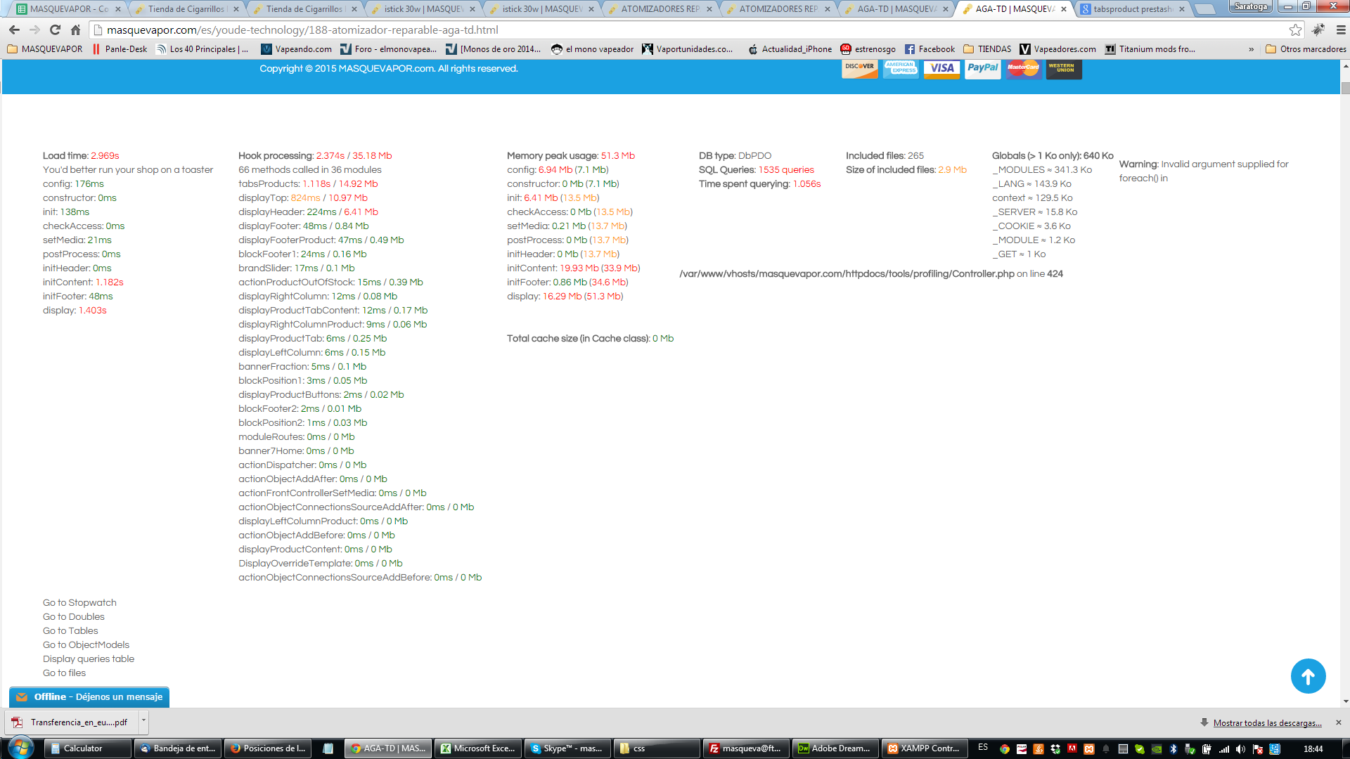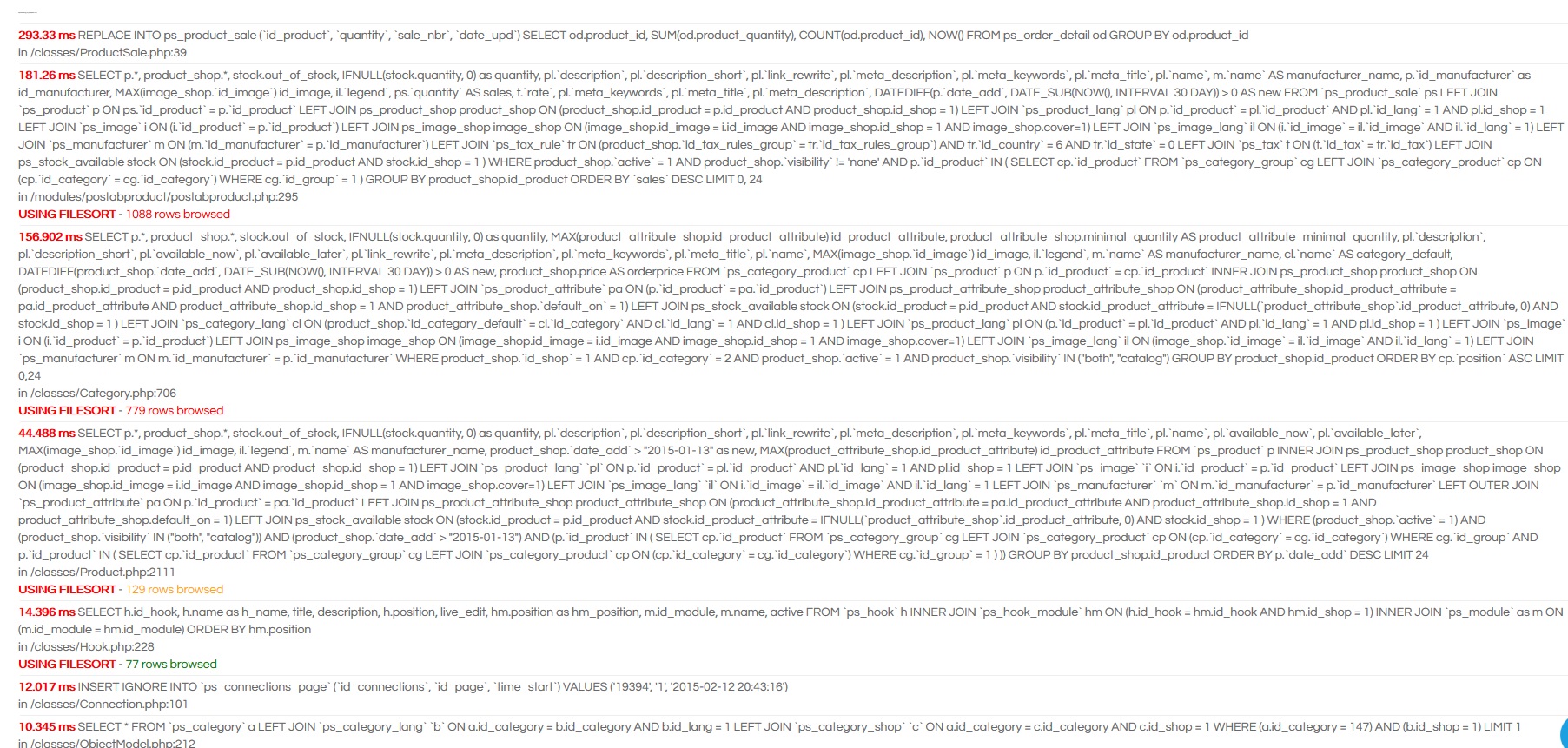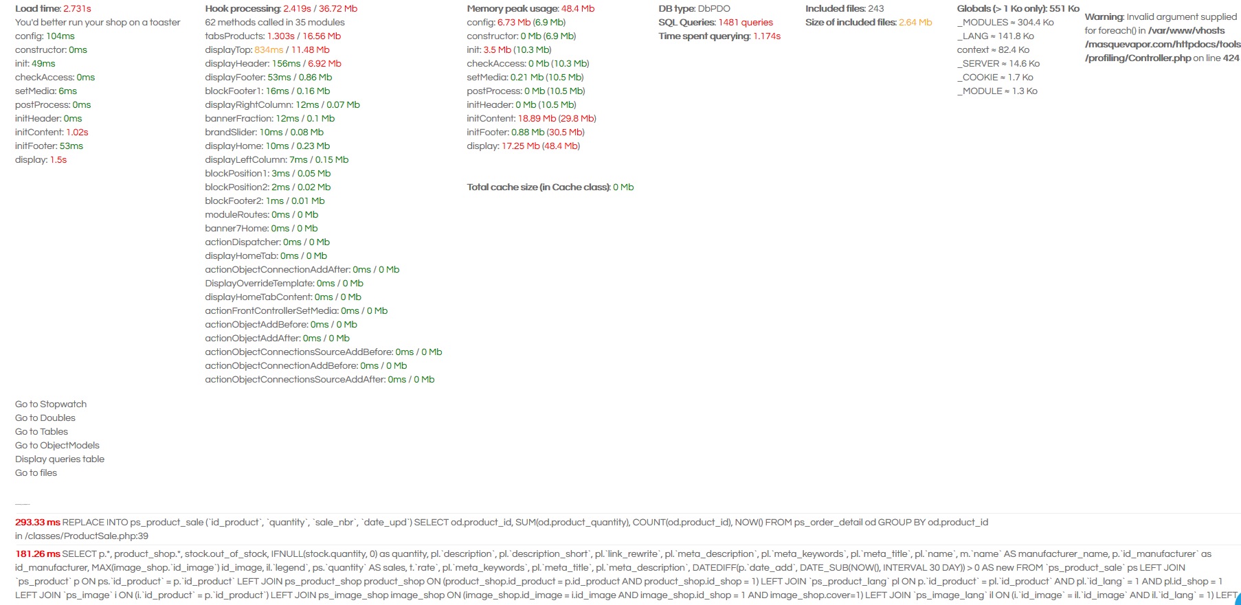 ialonso Posted February 12, 2015 Author Share Posted February 12, 2015 (edited) which version of 1.6? You have total of 20 .js files, several .css files. I suppose this is attempt to use server side combine javascript, not sure. 1.6 prestashop allows you to move all javascript bottom assuming that theme/modules compliant. Also it feels like you are using some sort of geo detector, i.e. I am currently in Spain, but my browser is english (en-us) and then (en). But I am served Spanish. Possible there is a redirect. regardless of the geo detection, it is not serving the correct language based on visitor browser, this is done by native PrestaShop this is why I supsect you have module or hack to do otherwise. cursory look at your report above, notice the time for 'tab products'? Hi El Patron, Thanks for your fast response. The version of prestashop that we are running is PrestaShop 1.6.0.6 . The hosting of our website is located in Spain. The website dont change automatically the languange based on the user procedence. Tab products is a module of the theme pos_corau (is the one that we are running, made by posthemes), it job is show the featured products in the home page. Anyway i have tryed disabling this module without changes at performance level. I attach bellow some pictures with a more detailed info about the processes that are taking more time on load. Thanks For your help, Isaac Edited February 12, 2015 by ialonso (see edit history) Link to comment Share on other sites More sharing options...