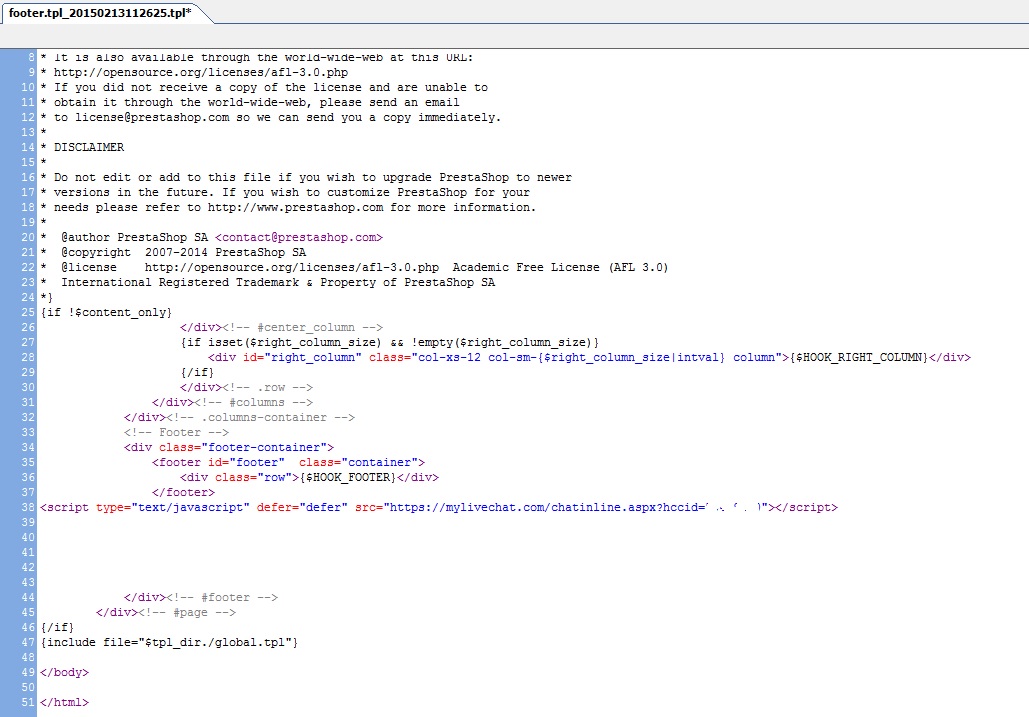 cutenature1 Posted February 13, 2015 Share Posted February 13, 2015 (edited) Add Mylivechat to your shop - to interact with your customers 1. Create your Mylivechat account HERE if you don't have 2. Select your inline template as shown in 3rd pic. 3. Copy html code as shown in 2nd pic. 4. Edit footer.tpl from /themes/default-bootstrap/footer.tpl 5. Paste copied html code just after </footer> as shown in 1st pic It will looks like in last pic. Enjoy direct interaction with your customers and visitors FREE like olark & zopim. With mylivechat, you have two platform to interactwith your customers and visitors a. webconsole b. Desktop Console If you have any problem please post here i will try to solve it................ Edited February 14, 2015 by cutenature1 (see edit history) Link to comment Share on other sites More sharing options...