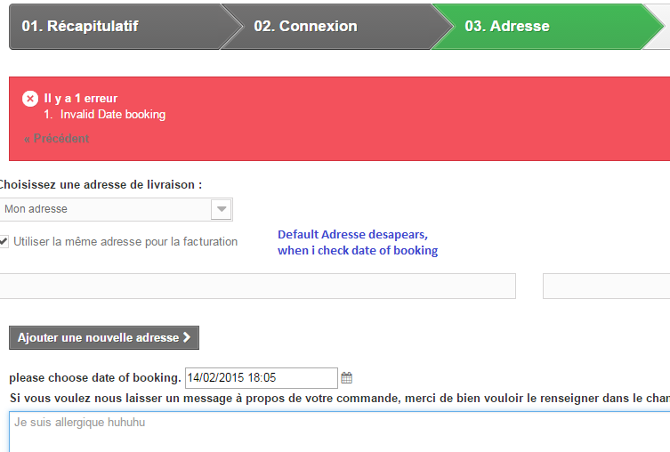 Elhousny Posted February 14, 2015 Share Posted February 14, 2015 (edited) Hi, Je veux ajouter une valeur dans le process de la commande. Mon problème est que l'adresse par défaut disparaît après l’exécution du validateur sur le champs. En plus, je veux zapper l'étape du transporteur. Donc, voilà mes modification J'ai ajouté le contrôle dans processAddress of OrderController: public function processAddress() { $same = Tools::isSubmit('same'); if (!Tools::getValue('id_address_invoice', false) && !$same) $same = true; if (!Customer::customerHasAddress($this->context->customer->id, (int) Tools::getValue('id_address_delivery')) || (!$same && Tools::getValue('id_address_delivery') != Tools::getValue('id_address_invoice') && !Customer::customerHasAddress($this->context->customer->id, (int) Tools::getValue('id_address_invoice')))) $this->errors[] = Tools::displayError('Invalid address', !Tools::getValue('ajax')); else { $this->context->cart->id_address_delivery = (int) Tools::getValue('id_address_delivery'); $this->context->cart->id_address_invoice = $same ? $this->context->cart->id_address_delivery : (int) Tools::getValue('id_address_invoice'); CartRule::autoRemoveFromCart($this->context); CartRule::autoAddToCart($this->context); if (!$this->context->cart->update()) $this->errors[] = Tools::displayError('An error occurred while updating your cart.', !Tools::getValue('ajax')); if (!$this->context->cart->isMultiAddressDelivery()) $this->context->cart->setNoMultishipping(); // If there is only one delivery address, set each delivery address lines with the main delivery address if (Tools::isSubmit('message')) $this->_updateMessage(Tools::getValue('message')); // Add checking for all addresses $address_without_carriers = $this->context->cart->getDeliveryAddressesWithoutCarriers(); if (count($address_without_carriers) && !$this->context->cart->isVirtualCart()) { if (count($address_without_carriers) > 1) $this->errors[] = sprintf(Tools::displayError('There are no carriers that deliver to some addresses you selected.', !Tools::getValue('ajax'))); elseif ($this->context->cart->isMultiAddressDelivery()) $this->errors[] = sprintf(Tools::displayError('There are no carriers that deliver to one of the address you selected.', !Tools::getValue('ajax'))); else $this->errors[] = sprintf(Tools::displayError('There are no carriers that deliver to the address you selected.', !Tools::getValue('ajax'))); } } $serviceDate = Tools::getValue('date_service_client', false); if ($serviceDate=='') $this->errors[] = Tools::displayError('Invalid Date booking'); if ($this->errors) { $this->setLocalMedia(); if (Tools::getValue('ajax')) die('{"hasError" : true, "errors" : ["' . implode('\',\'', $this->errors) . '"]}'); $this->step = 1; } if ($this->ajax) die(true); } J'ai modifier également cette fonction pour réduire le nombre des étapes: j'en ai pas besoin de définir le transporteur? public function initContent() { parent::initContent(); //$this->addJqueryPlugin(‘fancybox‘);//('bootstrap-datetimepicker.min.js'); if (Tools::isSubmit('ajax') && Tools::getValue('method') == 'updateExtraCarrier') { // Change virtualy the currents delivery options $delivery_option = $this->context->cart->getDeliveryOption(); $delivery_option[(int) Tools::getValue('id_address')] = Tools::getValue('id_delivery_option'); $this->context->cart->setDeliveryOption($delivery_option); $this->context->cart->save(); $return = array( 'content' => Hook::exec( 'displayCarrierList', array( 'address' => new Address((int) Tools::getValue('id_address')) ) ) ); die(Tools::jsonEncode($return)); } if ($this->nbProducts) $this->context->smarty->assign('virtual_cart', $this->context->cart->isVirtualCart()); if (!Tools::getValue('multi-shipping')) $this->context->cart->setNoMultishipping(); // 4 steps to the order switch ((int) $this->step) { case -1; $this->context->smarty->assign('empty', 1); $this->setTemplate(_PS_THEME_DIR_ . 'shopping-cart.tpl'); break; case 1: $this->_assignAddress(); $this->processAddressFormat(); if (Tools::getValue('multi-shipping') == 1) { $this->_assignSummaryInformations(); $this->context->smarty->assign('product_list', $this->context->cart->getProducts()); $this->setTemplate(_PS_THEME_DIR_ . 'order-address-multishipping.tpl'); } else $this->setTemplate(_PS_THEME_DIR_ . 'order-address.tpl'); break; /* HIELh ignore step 3 for carrier*/ case 2: if (Tools::isSubmit('processAddress')) $this->processAddress(); /* $this->autoStep(); $this->_assignCarrier(); $this->setTemplate(_PS_THEME_DIR_.'order-carrier.tpl'); break; */ case 3: // Check that the conditions (so active) were accepted by the customer $cgv = Tools::getValue('cgv') || $this->context->cookie->check_cgv; if (Configuration::get('PS_CONDITIONS') && (!Validate::isBool($cgv) || $cgv == false)) Tools::redirect('index.php?controller=order&step=2'); Context::getContext()->cookie->check_cgv = true; // Check the delivery option is set if (!$this->context->cart->isVirtualCart()) { if (!Tools::getValue('delivery_option') && !Tools::getValue('id_carrier') && !$this->context->cart->delivery_option && !$this->context->cart->id_carrier) Tools::redirect('index.php?controller=order&step=2'); elseif (!Tools::getValue('id_carrier') && !$this->context->cart->id_carrier) { $deliveries_options = Tools::getValue('delivery_option'); if (!$deliveries_options) $deliveries_options = $this->context->cart->delivery_option; foreach ($deliveries_options as $delivery_option) if (empty($delivery_option)) Tools::redirect('index.php?controller=order&step=2'); } } $this->autoStep(); // Bypass payment step if total is 0 if (($id_order = $this->_checkFreeOrder()) && $id_order) { if ($this->context->customer->is_guest) { $order = new Order((int) $id_order); $email = $this->context->customer->email; $this->context->customer->mylogout(); // If guest we clear the cookie for security reason Tools::redirect('index.php?controller=guest-tracking&id_order=' . urlencode($order->reference) . '&email=' . urlencode($em