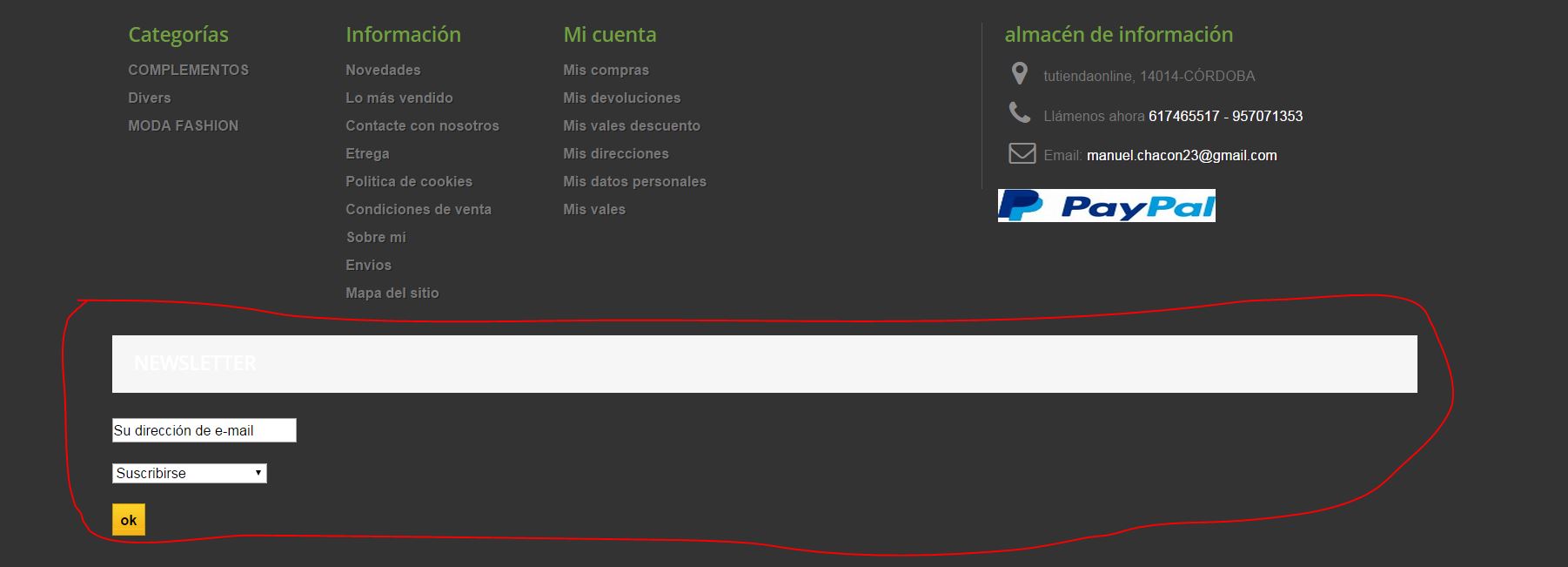 chacon Posted February 17, 2015 Share Posted February 17, 2015 Tienes que editar el contenido del modulo nuevo, asi <section class="footer-block col-xs-12 col-sm-2" id="new_footer_block"> Aqui el codigo que tengas, enlace, imagen...... </section> Te recomiendo que muevas los modulos mejor desde MÓDULOS / POSICIONES DE LOS MÓDULOS Vete al hook displayFooter Lleva el cursor hasta el numero que aparece y te saldrá un cursor de desplazamiento para que lo muevas donde quieras + Saludos , tengo un problema con el modulo newsletter. No encuentro la manera de quitarlo de la posición que tiene,me podríais ayudar, aquí os dejo unas capturas para que veáis. Gracias. Link to comment Share on other sites More sharing options...