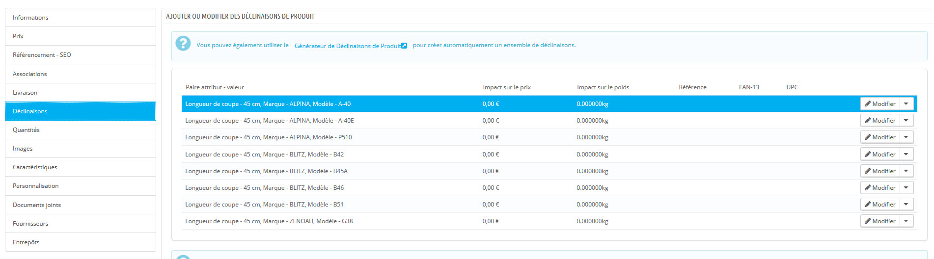 DavidCKW Posted February 18, 2015 Author Share Posted February 18, 2015 (edited) Merci pour l'intérêt porté à ma demande. Le module est activé uniquement sur une catégorie que vous pouvez voir sur la boutique de test : http://presta16.jrmotoculture.com/232-chaines-guides-par-marques-et-modeles-de-machines La boutique ressemble à du PS1.4 (c'est une exigence du client), mais c'est bien une boutique 1.6 J'ai fais quelques adaptations :- le 2ème et le 3ème critère ne se débloque que lorsque l'on a sélectionné le précédent - le résultat de la recherche ne s'affiche que quand j'ai sélectionné le 3ème critère (longueur de coupe) Si on sélectionne la marque AEG, seuls les modèles correspondants à cette marque s'affichent, car dans la déclinaison du produit de test, il n'y a que cette marque pour le même produit. Par contre, pour les marques Zenoah, Alpina et Blitz, tous les modèles confondus des marques s'affichent en même temps car sur un même produit il y a plusieurs marques et plusieurs modèles différents. Vous pouvez voir la configuration des déclinaisons d'un produit de test sur l'imprim écran en pièce jointe. Par exemple, si on sélectionne la marque Zenoah, je voudrais que seul le modèle G38 apparaisse. Merci d'avance pour votre retour. Edited February 18, 2015 by DavidCKW (see edit history) Link to comment Share on other sites More sharing options...