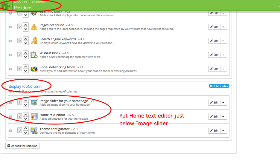 PascalVG Posted February 22, 2015 Share Posted February 22, 2015 Hi Nello, As you have the block currently already above the slider, that should mean you already have it 'hooked' in the displayTopColumn hook. (If not, let me know, then I tell you how to move the module to this hook) Go to back office: Go to modules->Positions. There you see a block called: DisplayTopColumn with probably three modules: Make sure that you put the home text editor just below the Slider module (you can click on the arrows up/down next to the position number to move the module to its new position) When done, reload your front page (Ctrl-F5 (Windows)/Cmd-R (Mac)) and see if it works. Hope this helps, pascal. Link to comment Share on other sites More sharing options...
