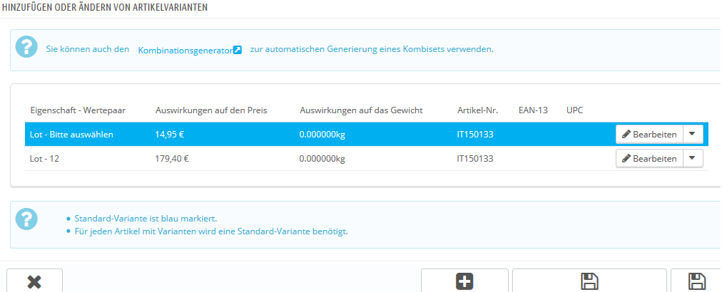 Steffen.f Posted February 20, 2015 Share Posted February 20, 2015 Hallo, Ich hoffe mir kann jemand weiterhelfen da wir kurz vorm verzweifeln sind Folgende Situation: Wir verkaufen Artikel nur Paketweise und nicht einzeln. Dafür haben wir je Artikel Varianten erstellt dass die einmal mit dem Einzelpreis erscheinen und dann z.b. in einem 10er Paket. Diese Varianten haben dann natürlich Auswirkung auf den Preis (). Wenn da jemand eine leichtere Lösung hat immer her damit Jetzt aber folgendes: Wir bekommen Kunden dazu die einen höheren Preis bekommen sollen (neue Kundengruppe ist angelegt). Jeder Artikel 1 Euro mehr. Wie kann man das am einfachsten lösen damit es sich auch auf die Artikelvarianten auswirkt. Ich habe schon versucht bei jedem Artikel unter Sonderpreis 2 Varianten zu erstellen und dann einfach den neuen Preis für die Kundenkategorie einzutragen. Doch leider funktioniert das immer nur für eine Variante und nicht für beide. Weiß da jemand wie man dies am einfachsten lösen kann? Oder kennt jemand ein Modul mit dem sowas besser zu verwalten geht? Oder kann da jemand helfen Im Quellcode was abzuändern? Beispiel: http://www.modeaktuell.net/mas/index.php?id_product=263&controller=product#/lot-bitte_auswahlen Für jede Hilfe bin ich sehr dankbar! Link to comment Share on other sites More sharing options...