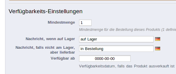 eleazar Posted February 21, 2015 Share Posted February 21, 2015 Grundsätzlich zwei Möglichkeiten. Wenn du an einer rechtssicheren Lösung für PrestaShop in Deutschland interessiert bist, gibt es für 1.5x sowieso nur die Möglichkeit, eine der kostenfreien Erweiterungen (germaNext oder GC German) zu installieren. Bei germaNext bin ich mir nicht sicher, aber GC German jedenfalls bringt diese globale Einstellungsmöglichkeit mit. Die andere Methode wäre ein globales Update über PHPMyAdmin. Hier klickst du im Menü auf SQL und gibst folgende Befehle im Fenster ein: UPDATE `ps_product_lang` SET `available_now` = "1-2 Werktage" WHERE `available_now` = "" UPDATE `ps_product_lang` SET `available_later` = "wieviel auch immer Werktage" WHERE `available_later` = "" Falls du ein anderes Tabellen-Präfix als "ps_" hast, wäre das natürlich zu ändern. Der anzuzeigende Text für die beiden Einstellungen ist natürlich auch beliebig. Für Ausführungen der SQL-Befehle jeweils weiter unten auf den Button "Go" klicken. 1 Link to comment Share on other sites More sharing options...