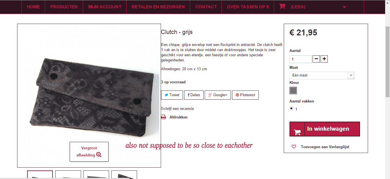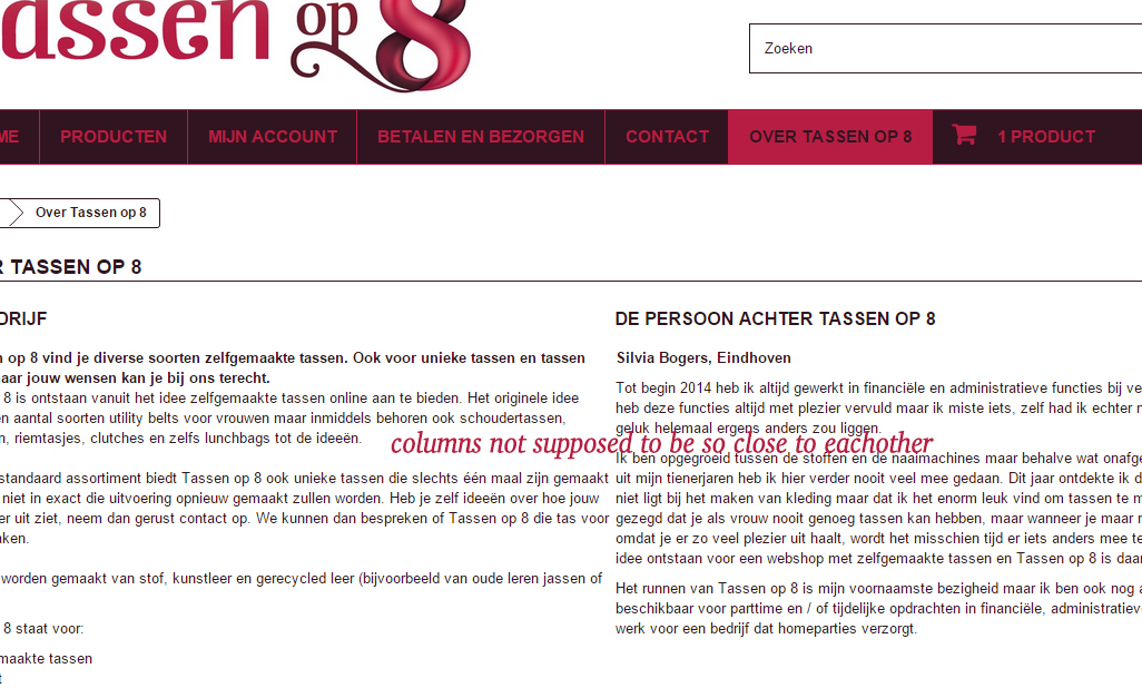 Silvia - Tassen op 8 Posted February 25, 2015 Author Share Posted February 25, 2015 (edited) Well, it fixes part of the problem, but it creates new problems. There is only one global.css right? Couldn't find a second one. In a mobile version, the shopping cart is better visible, but still not the way I would want it to be. On the website, the center text is now directly next to the left column. On other pages, the center column is overlapping the left column. I've added screenshots. Edited February 25, 2015 by Silvia - Tassen op 8 (see edit history) Link to comment Share on other sites More sharing options...