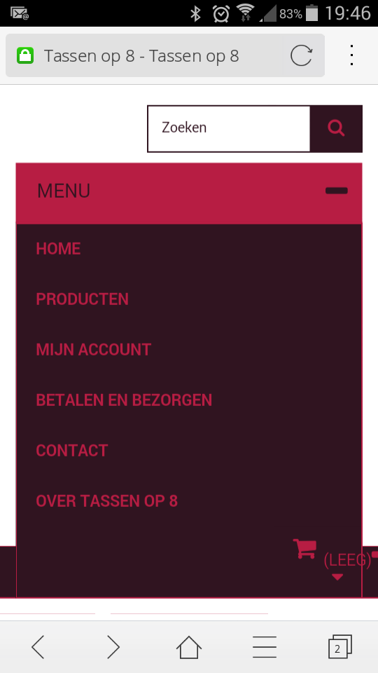 Silvia - Tassen op 8 Posted February 23, 2015 Share Posted February 23, 2015 (edited) Hello, I've searched the internet and the prestashop forum for hours but I can't get my shopping cart in my blocktopmenu right. I've tried the solution given in this topic but it's not fully working. When I go to my site on my own laptop (using Chrome) everything looks fine (added sceenshot). But when i make the screen smaller of go to my site on my phone, the shopping cart isn't staying in place and is deformed. Website: https://tassenop8.nl/index.php Prestashop version: 1.6.0.9 Blocktopmenu.tpl: <!-- {if $MENU != ''} --> <!-- Menu --> <div id="block_top_menu" class="sf-contener clearfix col-lg-12"> <div class="cat-title">{l s="Categories" mod="blocktopmenu"}</div> <ul class="sf-menu clearfix menu-content"> {$MENU} {if $MENU_SEARCH} <li class="sf-search noBack" style="float:right"> <form id="searchbox" action="{$link->getPageLink('search')|escape:'html':'UTF-8'}" method="get"> <p> <input type="hidden" name="controller" value="search" /> <input type="hidden" value="position" name="orderby"/> <input type="hidden" value="desc" name="orderway"/> <input type="text" name="search_query" value="{if isset($smarty.get.search_query)}{$smarty.get.search_query|escape:'html':'UTF-8'}{/if}" /> </p> </form> </li> {/if} <!-- /ul --> <!-- /div--> <!--/ Menu --> <!-- {/if} --> blockcart.tpl: {* * 2007-2014 PrestaShop * * NOTICE OF LICENSE * * This source file is subject to the Open Software License (OSL 3.0) * that is bundled with this package in the file LICENSE.txt. * It is also available through the world-wide-web at this URL: * http://opensource.org/licenses/osl-3.0.php * If you did not receive a copy of the license and are unable to * obtain it through the world-wide-web, please send an email * to [email protected] so we can send you a copy immediately. * * DISCLAIMER * * Do not edit or add to this file if you wish to upgrade PrestaShop to newer * versions in the future. If you wish to customize PrestaShop for your * needs please refer to http://www.prestashop.com for more information. * * @author PrestaShop SA <[email protected]> * @copyright 2007-2014 PrestaShop SA * @license http://opensource.org/licenses/osl-3.0.php Open Software License (OSL 3.0) * International Registered Trademark & Property of PrestaShop SA *} <li style="float: right;"> <!-- MODULE Block cart --> {if isset($blockcart_top) && $blockcart_top} <div class="col-sm-4 clearfix{if $PS_CATALOG_MODE} header_user_catalog{/if}"> {/if} <div class="shopping_cart"> <a href="{$link->getPageLink($order_process, true)|escape:'html':'UTF-8'}" title="{l s='View my shopping cart' mod='blockcart'}" rel="nofollow"> <!-- <b>{l s='Cart' mod='blockcart'}</b> UITGEZET IVM FORMAAT WINKELWAGEN --> <span class="ajax_cart_quantity{if $cart_qties == 0} unvisible{/if}">{$cart_qties}</span> <span class="ajax_cart_product_txt{if $cart_qties != 1} unvisible{/if}">{l s='Product' mod='blockcart'}</span> <span class="ajax_cart_product_txt_s{if $cart_qties < 2} unvisible{/if}">{l s='Products' mod='blockcart'}</span> <span class="ajax_cart_total{if $cart_qties == 0} unvisible{/if}"> {if $cart_qties > 0} {if $priceDisplay == 1} {assign var='blockcart_cart_flag' value='Cart::BOTH_WITHOUT_SHIPPING'|constant} {convertPrice price=$cart->getOrderTotal(false, $blockcart_cart_flag)} {else} {assign var='blockcart_cart_flag' value='Cart::BOTH_WITHOUT_SHIPPING'|constant} {convertPrice price=$cart->getOrderTotal(true, $blockcart_cart_flag)} {/if} {/if} </span> <span class="ajax_cart_no_product{if $cart_qties > 0} unvisible{/if}">{l s='(empty)' mod='blockcart'}</span> {if $ajax_allowed && isset($blockcart_top) && !$blockcart_top} <span class="block_cart_expand{if !isset($colapseExpandStatus) || (isset($colapseExpandStatus) && $colapseExpandStatus eq 'expanded')} unvisible{/if}"> </span> <span class="block_cart_collapse{if isset($colapseExpandStatus) && $colapseExpandStatus eq 'collapsed'} unvisible{/if}"> </span> {/if} </a> {if !$PS_CATALOG_MODE} <div class="cart_block block exclusive"> <div class="block_content"> <!-- block list of products --> <div class="cart_block_list{if isset($blockcart_top) && !$blockcart_top}{if isset($colapseExpandStatus) && $colapseExpandStatus eq 'expanded' || !$ajax_allowed || !isset($colapseExpandStatus)} expanded{else} collapsed unvisible{/if}{/if}"> {if $products} <dl class="products"> {foreach from=$products item='product' name='myLoop'} {assign var='productId' value=$product.id_product} {assign var='productAttributeId' value=$product.id_product_attribute} <dt data-id="cart_block_product_{$product.id_product}_{if $product.id_product_attribute}{$product.id_product_attribute}{else}0{/if}_{if $product.id_address_delivery}{$product.id_address_delivery}{else}0{/if}" class="{if $smarty.foreach.myLoop.first}first_item{elseif $smarty.foreach.myLoop.last}last_item{else}item{/if}"> <a class="cart-images" href="{$link->getProductLink($product.id_product, $product.link_rewrite, $product.category)|escape:'html':'UTF-8'}" title="{$product.name|escape:'html':'UTF-8'}"><img src="{$link->getImageLink($product.link_rewrite, $product.id_image, 'cart_default')}" alt="{$product.name|escape:'html':'UTF-8'}" /></a> <div class="cart-info"> <div class="product-name"> <span class="quantity-formated"><span class="quantity">{$product.cart_quantity}</span> x </span><a class="cart_block_product_name" href="{$link->getProductLink($product, $product.link_rewrite, $product.category, null, null, $product.id_shop, $product.id_product_attribute)|escape:'html':'UTF-8'}" title="{$product.name|escape:'html':'UTF-8'}">{$product.name|truncate:13:'...'|escape:'html':'UTF-8'}</a> </div> {if isset($product.attributes_small)} <div class="product-atributes"> <a href="{$link->getProductLink($product, $product.link_rewrite, $product.category, null, null, $product.id_shop, $product.id_product_attribute)|escape:'html':'UTF-8'}" title="{l s='Product detail' mod='blockcart'}">{$product.attributes_small}</a> </div