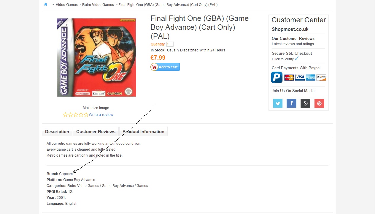 Nick20000 Posted February 23, 2015 Author Share Posted February 23, 2015 (edited) i would simply like to know why. when i click the link that is on this product information tab nothing shows up on the list for Final Fight? http://www.shopmost.co.uk/retro-video-games/1577-final-fight-one-gba-game-boy-advance-cart-only-pal.html just click Capcom link shown in this picture. added another. and this is the module i am using: https://www.prestashop.com/forums/topic/292948-free-exrta-product-tabs-module/ Edited February 23, 2015 by Nick20000 (see edit history) Link to comment Share on other sites More sharing options...