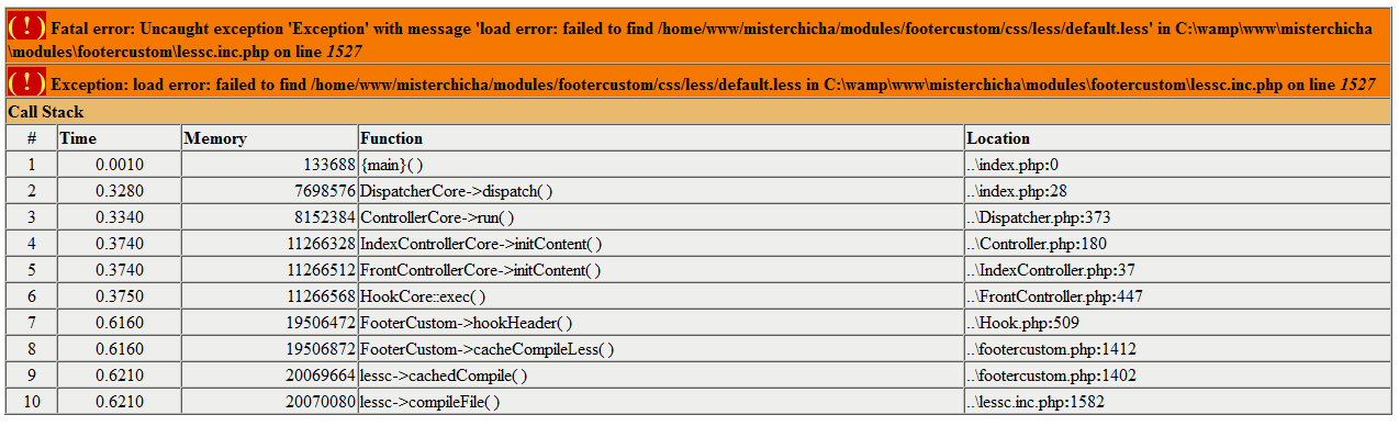 pakstyle Posted April 2, 2015 Author Share Posted April 2, 2015 J'ai fait comme tu as décrit oron mais toujours page blanche j'ai activé le PS_DEV_TRUE, j'ai comme erreur ceci : Link to comment Share on other sites More sharing options...
