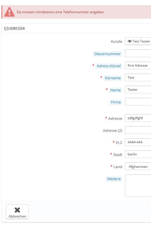 Wenn ich dann z.B. versuche die Adresse einen Kunden zu ändern, erhalte ich die Meldung ich muss eine Telefonnummer angeben.