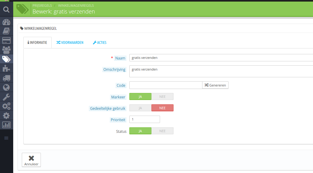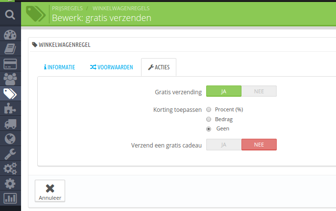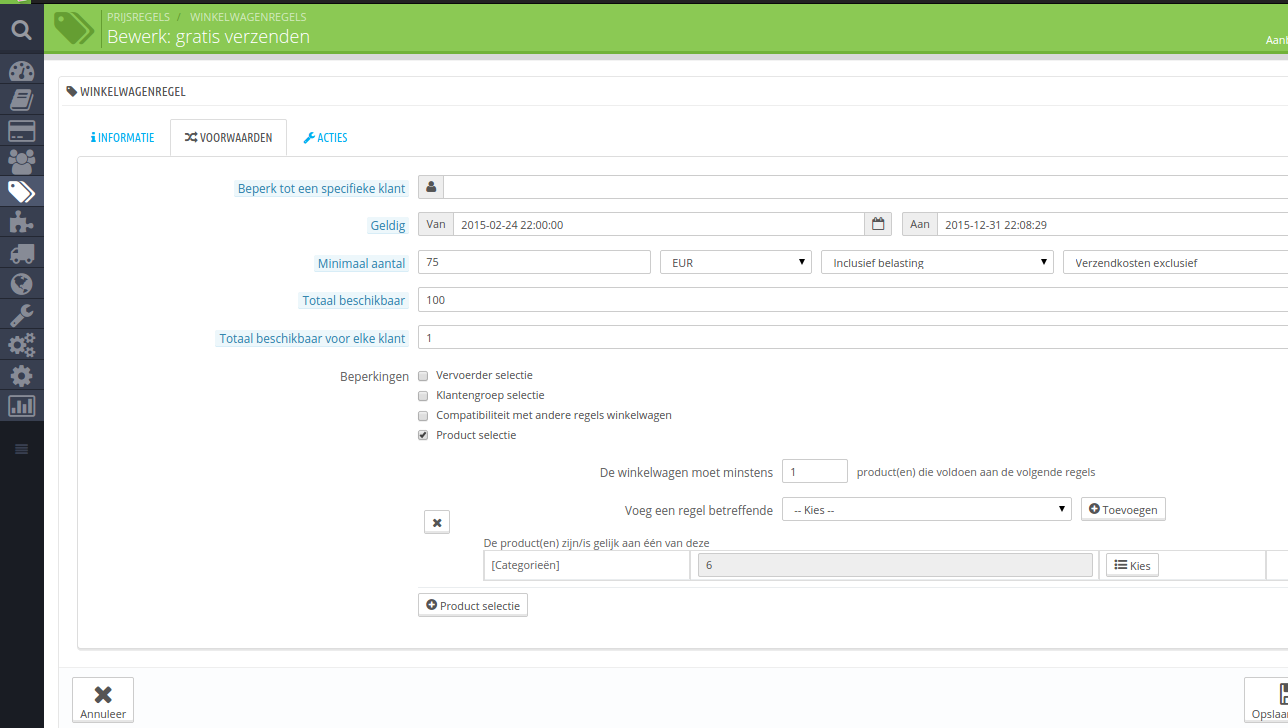 Prijsregel aangemaakt welke geld voor alle categorieën, behalve een nieuwe categorie waarin ik betreffende product heb gezet.