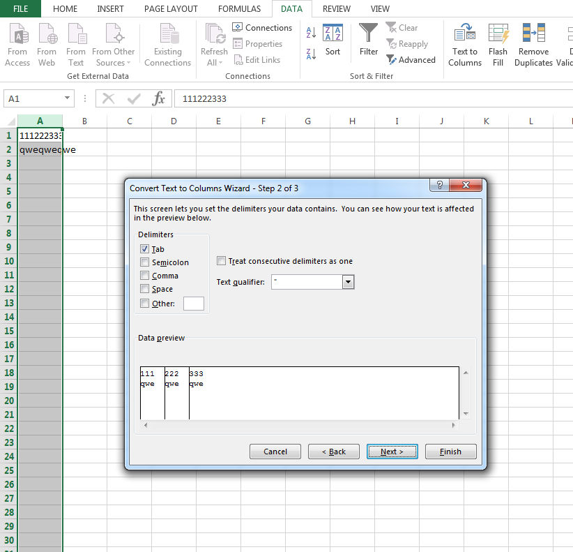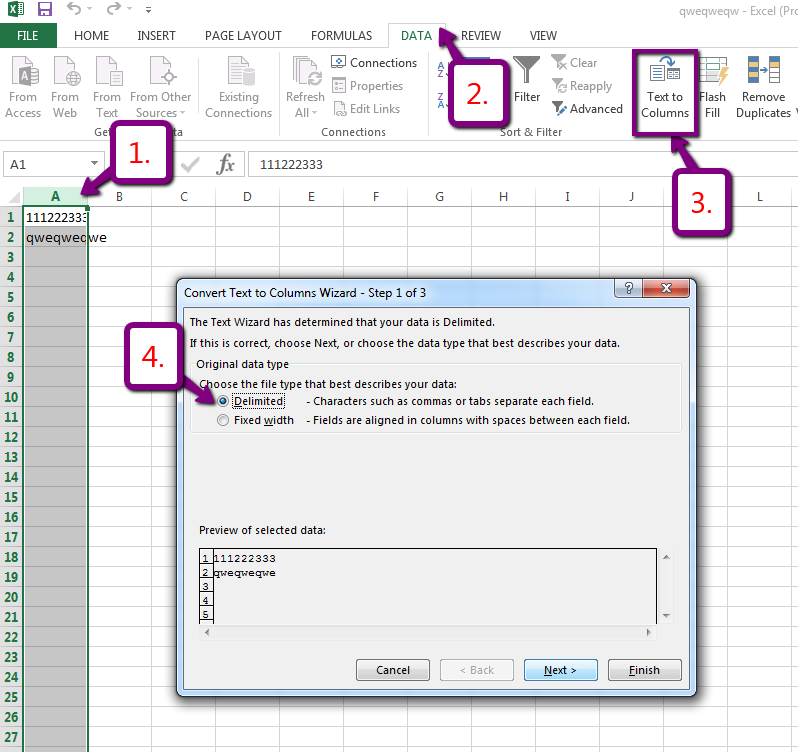 1. Open the file, select the column with data, click on DATA tab of the main menu, select "TEXT TO COLUMN" option and select separator, as it is shown in the screenshots