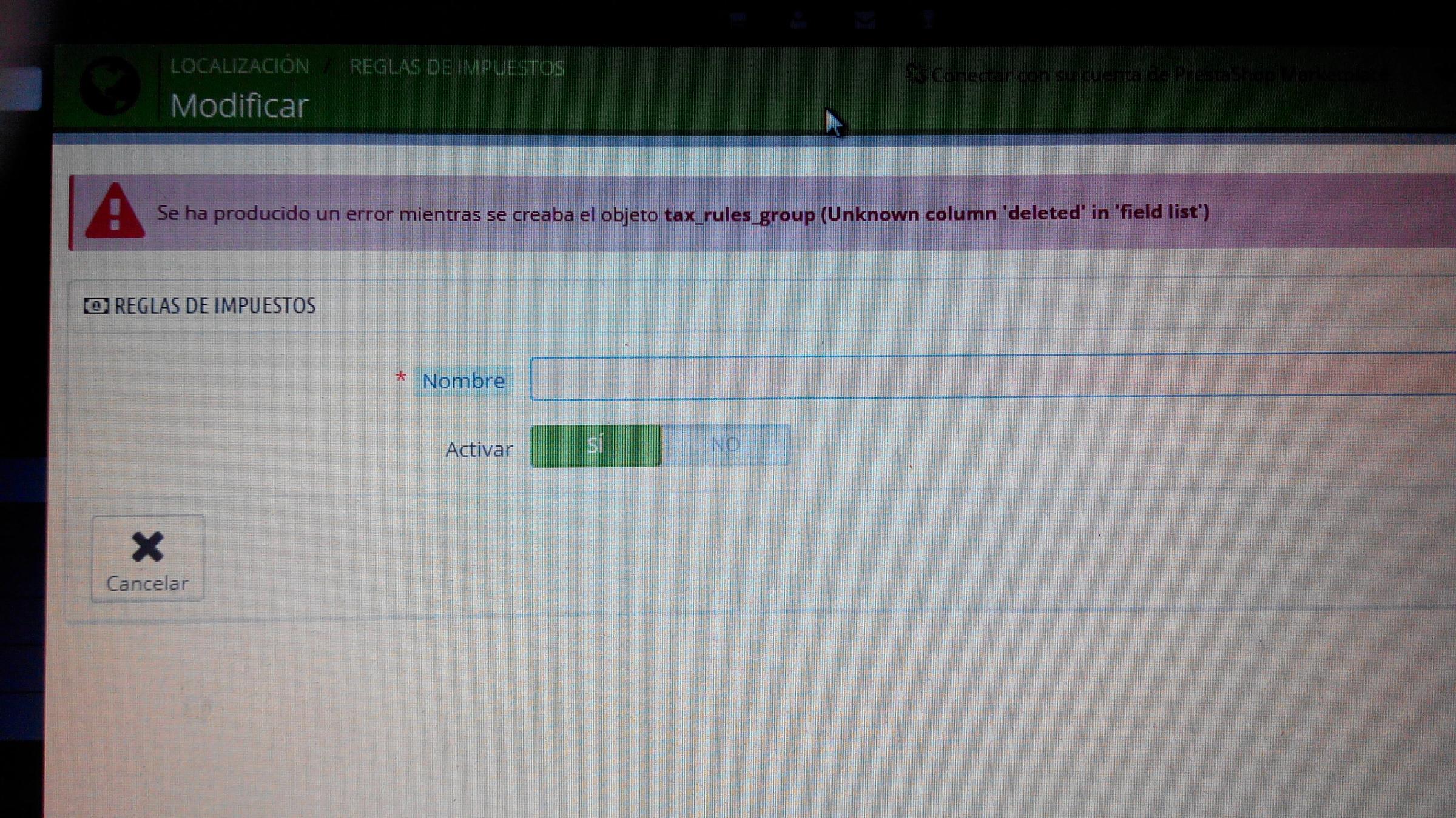 joanybox Posted February 26, 2015 Share Posted February 26, 2015 (edited) hola buenas a todos Haber si alguien me echa Una Mano con ESTO, CUANDO Creo Una regla de impuesto me da error Donde dados regla de Impuestos Mi Venta lo siguiente Se error ONU ha Producido MIENTRAS se creaba el Objeto tax_rules_group (columna Desconocido 'Borrado' en 'lista de campos') Ser alguien Que Sabe Florerias? gracias a todos Haber si me echais Una Mano Edited February 27, 2015 by joanybox (see edit history) Link to comment Share on other sites More sharing options...