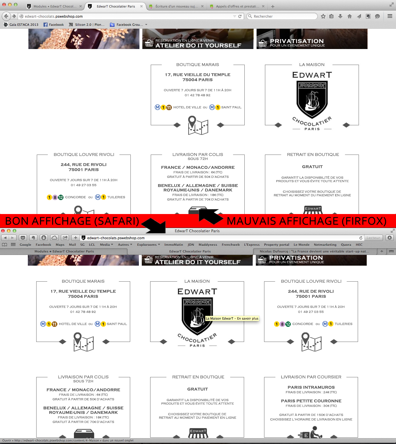 Thibaut Yor Posted February 28, 2015 Share Posted February 28, 2015 Bonjour,Je viens de me mettre à Prestashop (1.6). J'en suis plutot satisfait !... mais j'ai tout de même un petit probléme au niveau de la présentation de ma home page.J'ai supprimé le slider, mais j'ai par contre gardé les "bloc images", voir mon site (en construction, il manque du contenu) : http://edwart-chocolats.pswebshop.com/Ma question est la suivantes, j'éspére que vous pourrez m'éclairer, c'est surement tout béte ! Sur Firfox et Explorer, certains blocs sont décalés (voir PJ) ! Ce n'est pas le cas avec Safari et Chrome. Pourquoi ? Cela dévisage ma home page ... J'éspére avoir été clair, et j'éspére que quelqu'un aura la gentillesse de m'éclairer Merci d'avance ! Link to comment Share on other sites More sharing options...