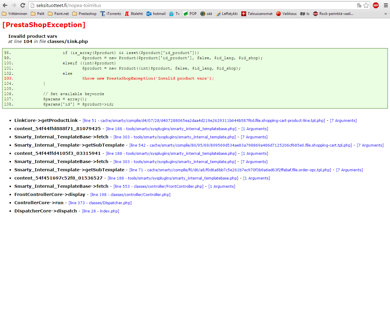 cille5 Posted March 2, 2015 Author Share Posted March 2, 2015 (edited) Debug mode shows these errors. Only with "one step checkout" 5 step checkout works without any problems. I got this custom theme from leotheme.com -Is the problem in theme or prestashop? See image. Edited March 2, 2015 by cille5 (see edit history) Link to comment Share on other sites More sharing options...