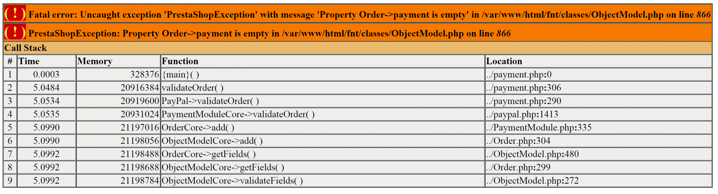 Fatal error: Uncaught exception 'PrestaShopException' with message 'Property Order->payment is empty' in /home/minigirl/public_html/classes/ObjectModel.php:866 Stack trace: #0 /home/minigirl/public_html/classes/ObjectModel.php(272): ObjectModelCore->validateFields() #1 /home/minigirl/public_html/classes/order/Order.php(299): ObjectModelCore->getFields() #2 /home/minigirl/public_html/classes/ObjectModel.php(480): OrderCore->getFields() #3 /home/minigirl/public_html/classes/order/Order.php(304): ObjectModelCore->add(true, true) #4 /home/minigirl/public_html/classes/PaymentModule.php(335): OrderCore->add() #5 /home/minigirl/public_html/modules/paypal/paypal.php(1413): PaymentModuleCore->validateOrder(40, 2, 5, '', 'Payment accepte...', Array, 1, false, 'c7f790a16cd2692...', Object(Shop)) #6 /home/minigirl/public_html/modules/paypal/express_checkout/payment.php(290): PayPal->validateOrder(40, 2, 5, '', 'Payment accepte...', Array, 1, false, 'c7f790a16cd2692...', Object(Shop)) #7 /home/minigirl/public_html/modules/paypal/expre in /home/minigirl/public_html/classes/ObjectModel.php on line 866