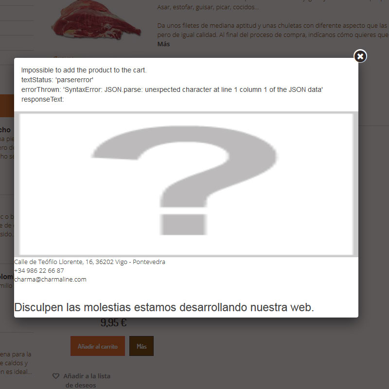 ecoloco2 Posted March 2, 2015 Share Posted March 2, 2015 Hola nuevamente. Estoy teniendo varios inconvenientes a la hora de crear una cuenta de usuario.a cual cuando coloco el correo y presiono sobre el botón "crear cuenta" me muestra este error: TECHNICAL ERROR: unable to load form. Details: Error thrown: [object Object] Text status: parsererror Y cuando trato de comprar algún producto me muestra el siguiente error: Impossible to add the product to the cart.textStatus: 'parsererror'errorThrown: 'SyntaxError: JSON.parse: unexpected character at line 1 column 1 of the JSON data'responseText: Adicional coloco un pantallazo para que puedan darse una idea del error. Muchísimas gracias por toda la ayuda que me puedan facilitar. Saludos... Link to comment Share on other sites More sharing options...