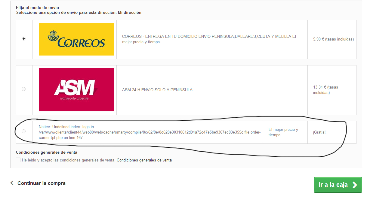 coopermg Posted March 3, 2015 Share Posted March 3, 2015 Hola me sale un error cuando llegamos a la compra de cualquier producto, con esta linea. Notice: Undefined index: logo in /var/www/clients/client44/web80/web/cache/smarty/compile/8c/62/8e/8c628e30310612d94a72c47e5be9367ec83e355c.file.order-carrier.tpl.php on line 167 No deberia de salir esta posibilidad, ya que tengo los dos transportistas elegidos por defecto. como soluciono el tema. www.saneamador.es PRESTASHOPO 1.6 Link to comment Share on other sites More sharing options...