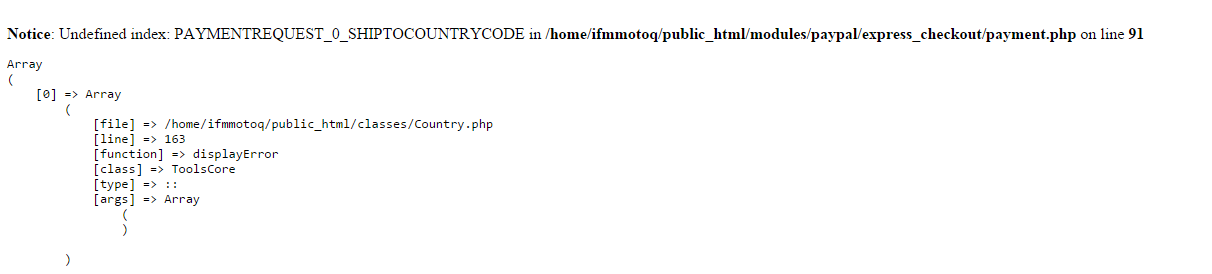 tizdaz Posted March 4, 2015 Author Share Posted March 4, 2015 ok think ive managed to find the error: Notice: Undefined index: PAYMENTREQUEST_0_SHIPTOCOUNTRYCODE in /home/ifmmotoq/public_html/modules/paypal/express_checkout/payment.php on line 91 ? Link to comment Share on other sites More sharing options...