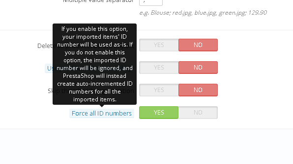 kingsinnersoul Posted March 6, 2015 Author Share Posted March 6, 2015 (edited) Are you sure? Prestashop does ALLOW to FORCE IDs. It is one of the only few options that the native import page offers!!! But, I will show you if you do not believe me: Attachment #1: 1.PNG -> shows the option in the BackOffice = Advanved Paramters > CSV Import > Products > Force All ID Numbers Attachment #2: 2.PNG -> shows the couple first columns in my CSV import file, which had ID 9999 (currently have 832 products imported with your Store Manager) Attachment #3: 3.PNG -> shows that after that single line CSV was imported, the ID was FORCED, per the selected option, and now my store has products with IDs from 1-832, and product # 833 has ID 9999... And the quote I added in the OP was from Store Manager Docu pages... Not from Prestashop... Edited March 6, 2015 by kingsinnersoul (see edit history) Link to comment Share on other sites More sharing options...