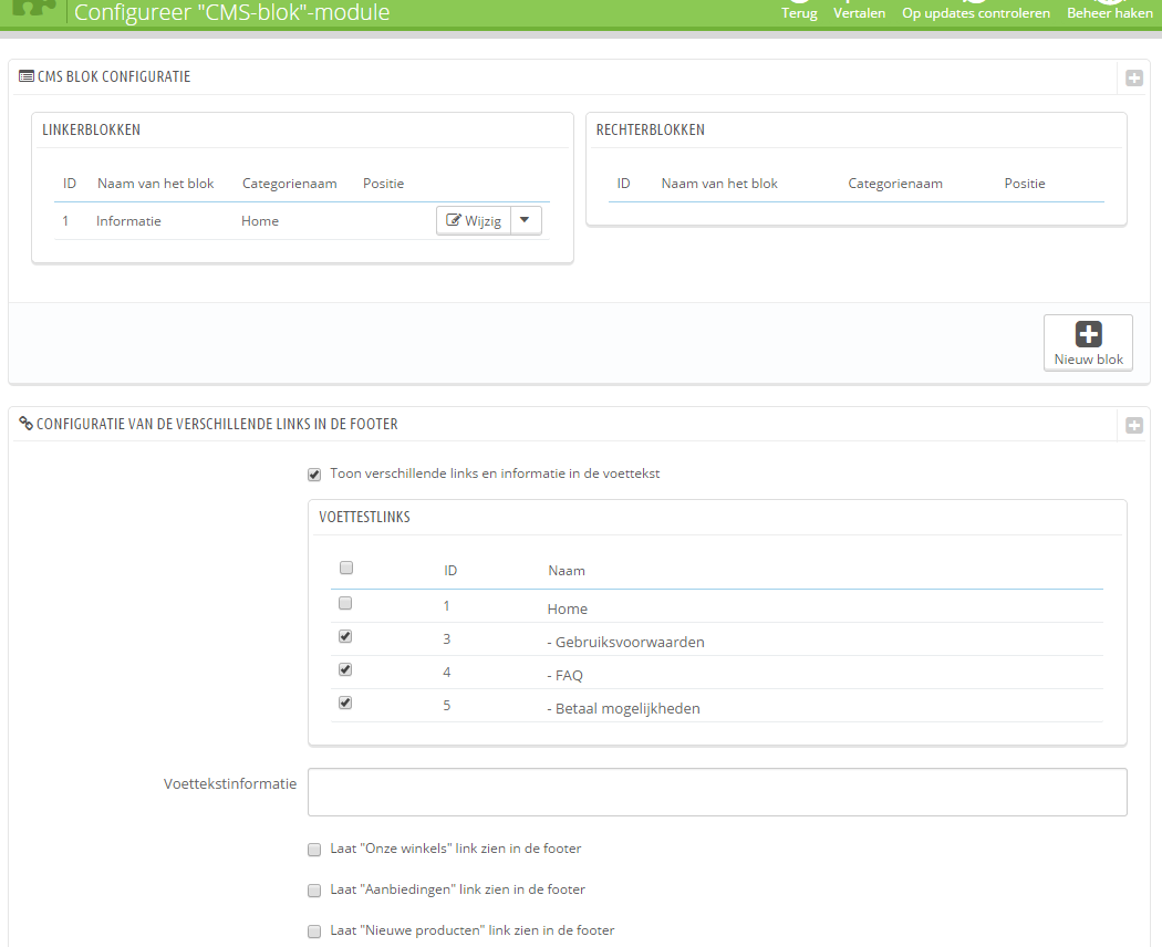 pietkei Posted March 6, 2015 Share Posted March 6, 2015 (edited) Hallo, Mijn versie PrestaShop: 1.6 Vraag: Onder een categorie staat in de linker kolom Informatie, met daaronder bijv. Gebruiksvoorwaarden maar ook ONZE WINKELS. Ik heb in alle modules gekeken waar ik deze optie kon verwijderen, in geen enkele CMS module kom ik Onze Winkels tegen, wel alle andere info gegevens. Ik heb alle andere topics hierover bekeken, maar daar vond ik niet de oplossing. Kan iemand mij in de richting wijzen waar ik dat kan verwijderen? Alvast bedankt! Edited March 9, 2015 by pietkei (see edit history) Link to comment Share on other sites More sharing options...