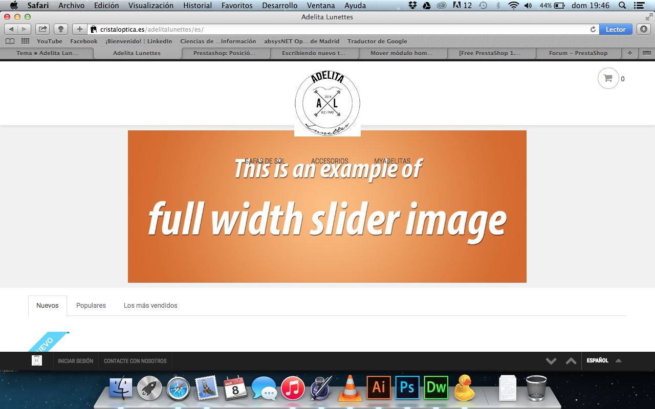 2- Me gustaría que la imagen que tengo en el slider ocupara todo (o casi todo) el ancho de la página. He probado varias cosas que ponía en diversos tutoriales pero no hay manera de cambiarlo. No es problema del tamaño de la imagen en sí, deduzco que tiene que ser algún problema del CSS pero no sé dónde está lo que tengo que cambiar.