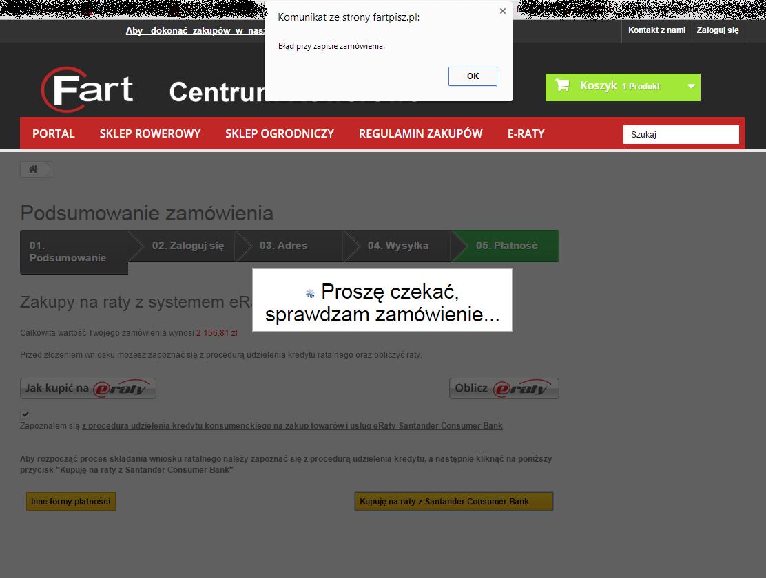 Wiadomość W momencie kliknięcia przycisku "Kupuję na raty z Santander Consumer Bank", jest uruchamiany request ajax'owy który wykonuje zapis utrwalający wniosek w bazie danych PrestaShop. W tym czasie ekran jest blokowany do momentu otrzymania potwierdzenia wykonania zapisu w bazie Presta (lub upłyniecia timeout). Dopiero po otrzymaniu potwierdzenia że w bazie sklepu PrestaShop zapisano aktualną postać zamówienia, jest wykonywany submit na stronę www.wniosek.eraty.pl gdzie dokonywana jest rejestracja danych wnisoku kredytowego. Załączony zrzut ekranu sugeruje że błąd miał miejsce przy zapisie zamówienia w bazie sklepu PrestaShop. Trudno na tej podstawie wyrokować co poszło nie tak. Jednak wyjaśnień szukałbym w plikach z logami PHP na serwerze sklepu. Znaczenie komunikatów po kliknięciu klawisza: 1. "Proszę czekać trwa sprawdzenie zamówienia" - walidacja i zapis do bazy sklepu PrestaShop 2. "Łączę się z serwisem bankowym" - wysyłanie formularza wniosku na serwer bankowy. Komunikat powinien utrzymywać sie wzglednie krótko, po czym powinna pojawić się strona Banku. 3. "Błąd przy zapisie zamówienia." - wywołany Ajaxe'em zapis wniosku (punkt 1) nie powiódł się.