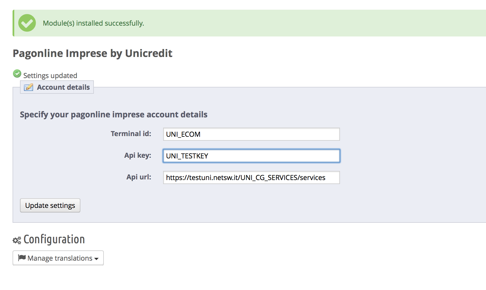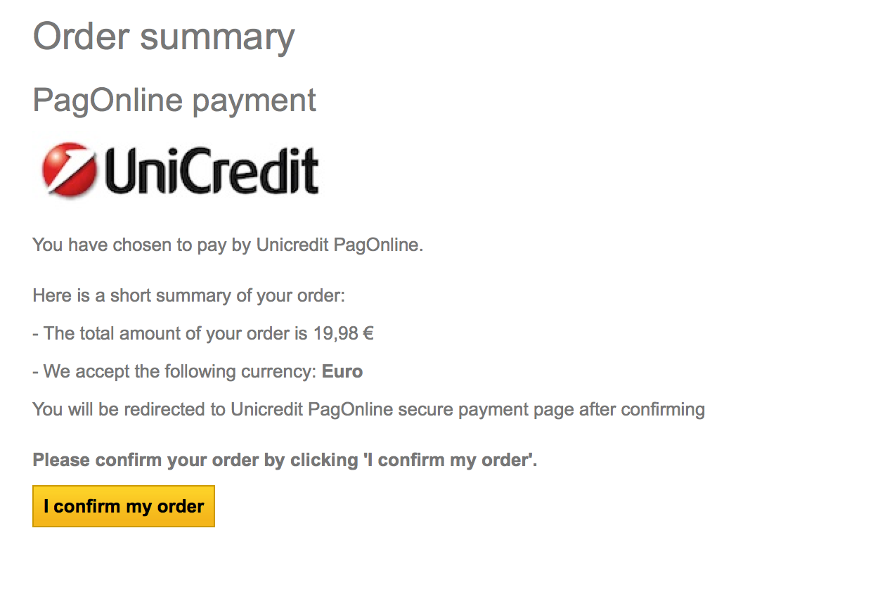 yameveo Posted March 11, 2015 Share Posted March 11, 2015 Buongiorno a tutti, la nostra azienda ha realizzato un nuovo modulo per consentire i pagamenti attraverso Pagonline Imprese di Unicredit. Il funzionamento e l'installazione del modulo sono molto semplici e intuitivi. Il modulo è compatibile per le versioni di prestashop >= 1.5 e forniamo assistenza gratuita per eventuali malfunzionamenti riscontrati durante l'installazione. Alleghiamo screenshot e il link a dove potrete acquistare il modulo. Link to comment Share on other sites More sharing options...