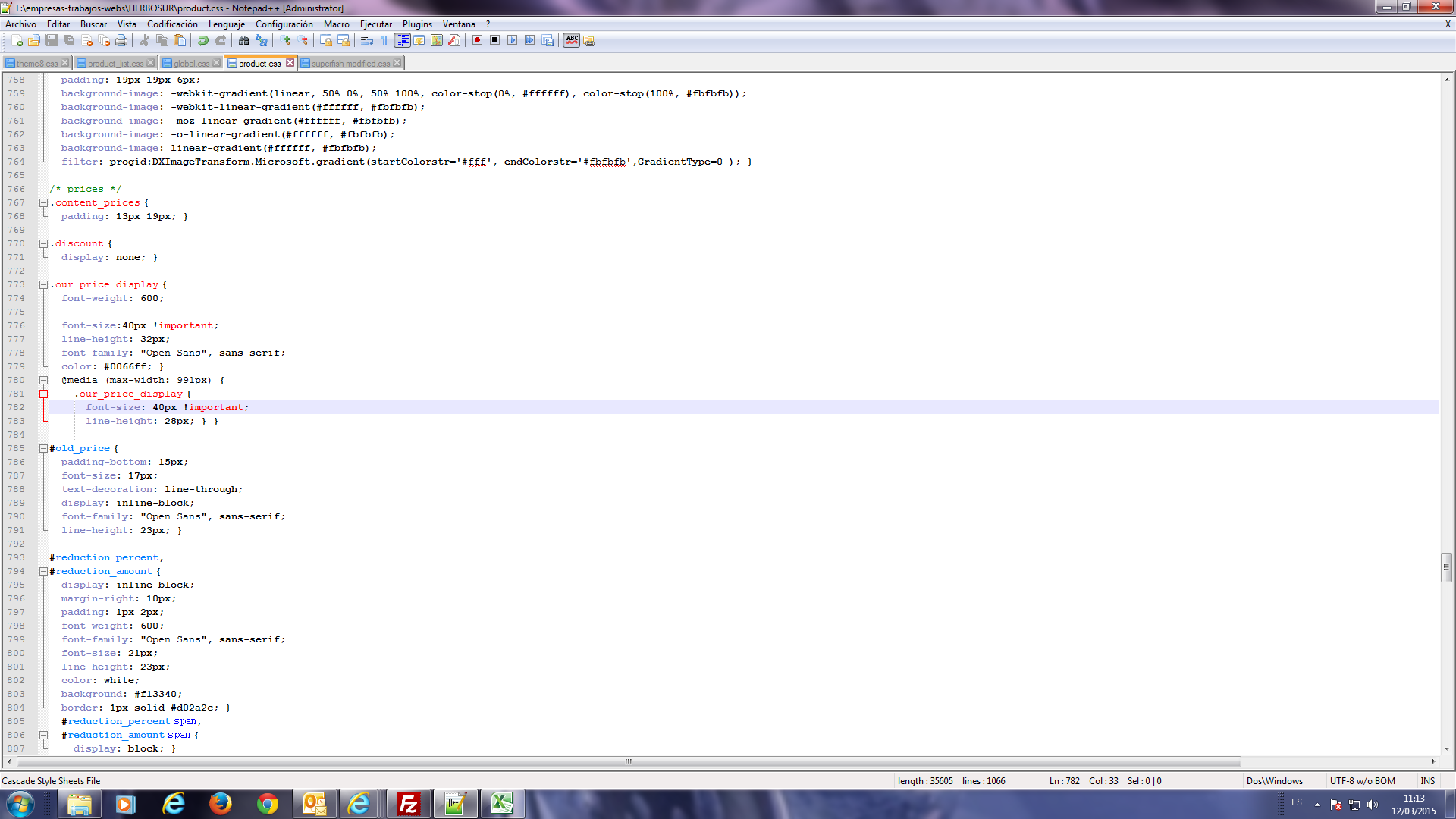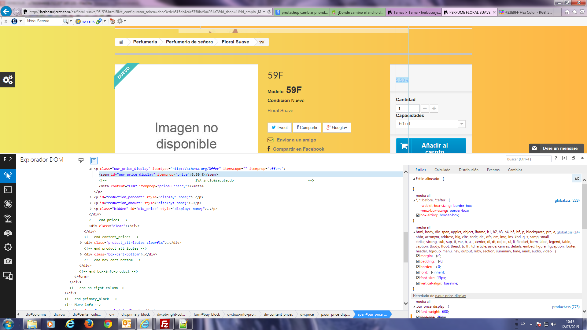 tudeporteysalud Posted March 12, 2015 Share Posted March 12, 2015 (edited) Buenos Dias, me dirijo a Vd,, ya que otras veces me habéis ayudado a solventar problemas.... os comento.... Estoy terminado una pagina y en la pantalla donde puedes ver el articulo, quiero cambiar el tamaño del precio. el tema esta en que dicho tamaño lo tengo heredado del GLOBAL.CSS en la línea 14, y el tamaño lo tiene adquirido a 15px, con lo que si cambio ese tamaño como es normal cambia toda la pantalla, he intentado modificar el archivo PRODUCT.CSS pero no me toma ningún tamaño en ese fichero.... Como puedo quitar el orden de heredado con respecto al GLOBAL.CSS ????????? Adjunto pantalla.::: Edited March 13, 2015 by tudeporteysalud (see edit history) Link to comment Share on other sites More sharing options...