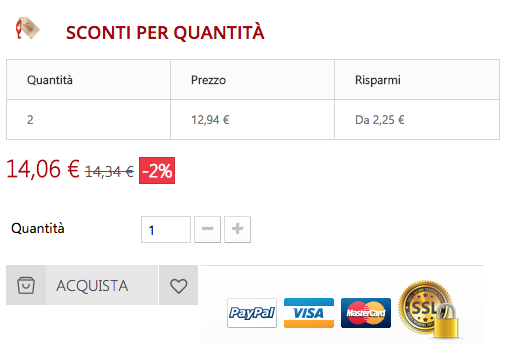 Medea Web Agency Posted March 12, 2015 Share Posted March 12, 2015 Ciao! Ho un problema, seguitemi: Ho creato un gruppo "rivenditori" ed ho impostato degli sconti in base alla quantità Nel caso che vedete in basso ad esempio: 2% di sconto per 1 quantità 8% di sconto da 2 quantità in poi Il problema è che gli sconti in tabella sono errati (nessun problema, invece, quando inserisco il prodotto nel carrello: il prezzo è giusto) 14,34 meno il 2% fa effettivamente 14,06 Ma 14,34 meno l'8% non fa 12,94 bensi 13,19 Insomma, la tabella somma gli sconti tra di loro (12,94 è infatti il risultato del prezzo scontato del 2% meno l'ulteriore sconto) Qualcuno ha il mio stesso problema?Come si risolve? Grazie ragazzi! Link to comment Share on other sites More sharing options...