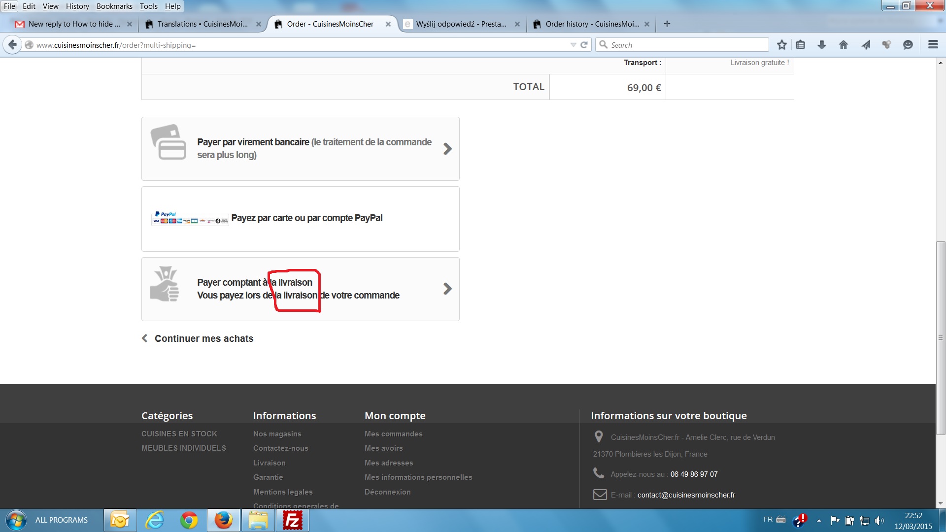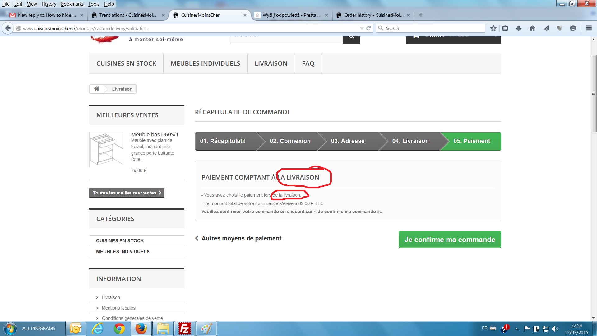 easydisplays Posted March 12, 2015 Share Posted March 12, 2015 Hi, I have a problem with the module COD. In fact what I need is CASH ON PICKUP AT STORE module, but I could not find any free module like that. So I thought that if I install COD module I would be able to change the one word from on "delivery" to on "pickup". Well the website is in French so I would use the correct French words. Anyways, I found on my server the folder with module cashondelivery and there is that file fr.php... I edited that file, changed the word from livraison (delivery) to collecte (pickup) and replaced the file on the server. After those changes the whole module stops working correctly, does not display all info and gives me an error 500 when I click to confirm the order. Does anybody knows how to fix that... ? Is it possible to change some words in a module file? Thanks for any help and sugestions. I am attaching some printscreens. Link to comment Share on other sites More sharing options...