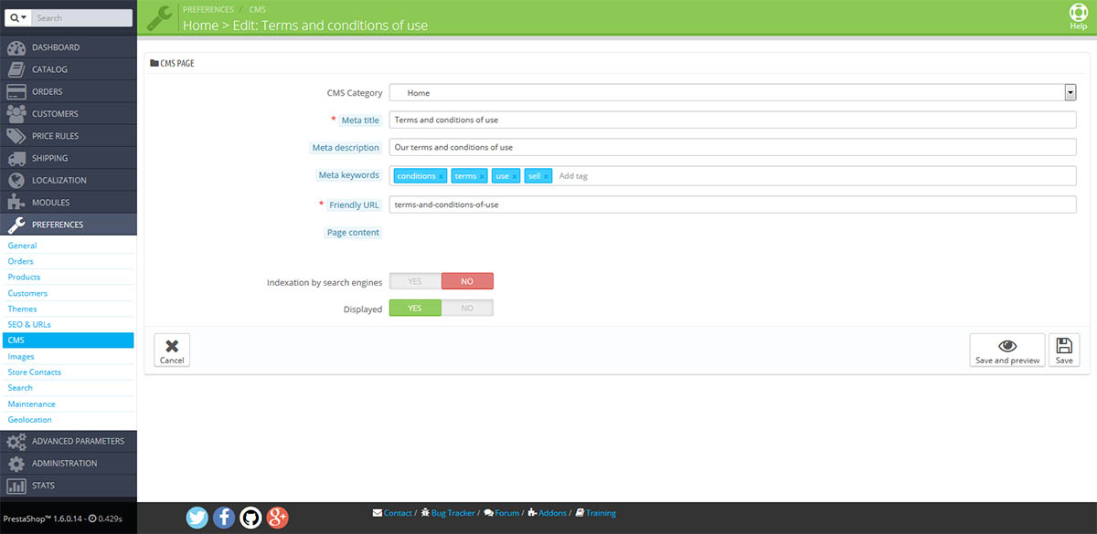 1. Under Preferences > CMS I'm trying to change the About Us page.  When I open this section the page content area is missing.  The store front end does however, show the default about us text if I follow the link in the footer.