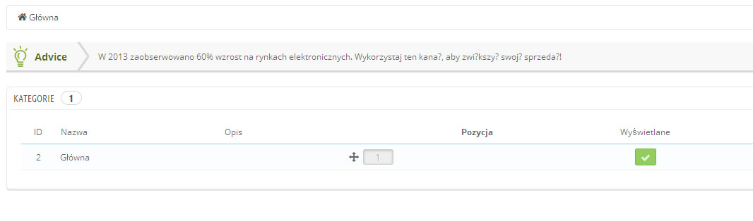 W panelu administracyjnym po wybraniu Katalog/Kategorie wyświetla się jedna kategoria Głowna. W nagłówku jest informacja, że znajdujemy się w kategorii "Główna" a na liście widnieje kategoria Główna (zał. 3.jpg)