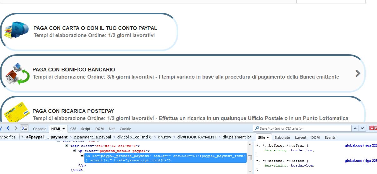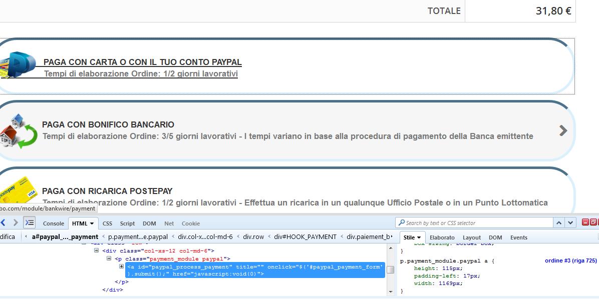 Vincent P. Posted March 13, 2015 Share Posted March 13, 2015 (edited) Salve a tutti sto cercando di allargare il Box del pagamento Paypal ma inutilmente, in pratica devo trovare questa stringa: p.payment_module.paypal a se analizzo l'elemento dice che è nel file ordine#3 riga 725 ma non trovo questo file come faccio, in pratica devo allieneare il bordo del Box Paypal a quello degli altri, qualcuno può aiutarmi? basterebbe semplicemente inserire i due valori e il gioco è fatto... ma dov'è il file??? Edited March 13, 2015 by Vincent P. (see edit history) Link to comment Share on other sites More sharing options...