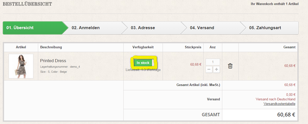 happykai Posted March 13, 2015 Share Posted March 13, 2015 (edited) Hallo, ich möchte den Verfügbarkeitsstatus in dem Warenkorb übersetzen(wo "In Stock" steht, soll "auf Lager" stehen), siehe Anhang Probiert habe ich in BO===>Lokalisierung===>Übersetzung gewesen und hab Front Office, Installierte Module durchgesucht, bin aber leider fündig geworden. Kann Jemand mir bitte einen Tipp geben? Vielen Dank im Voraus Gruß Kai Chen Edited March 13, 2015 by happykai (see edit history) Link to comment Share on other sites More sharing options...