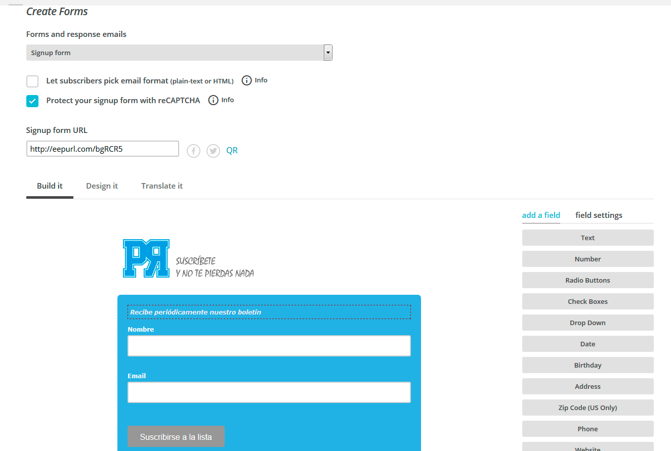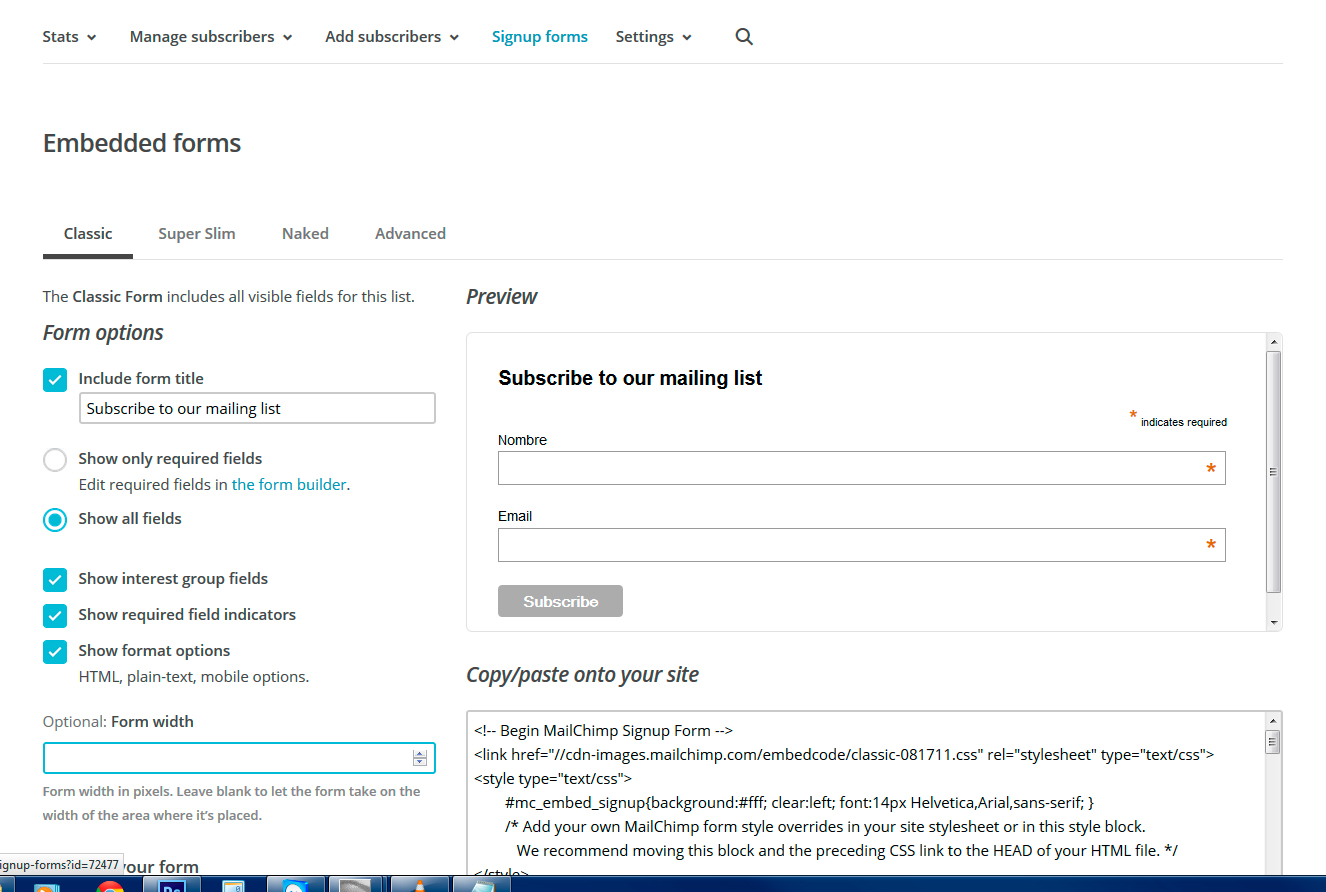 diversea Posted March 13, 2015 Share Posted March 13, 2015 Hola, abro este nuevo hilo, ya que pregunte en otro, pero como el título difiere bastante de lo que necesito, lo pongo directamente aquí. .................. Hola, viendo que habláis de mailchimp, quería comentar una duda.... Dentro de MailChimp, creo la lista para usuarios, creo un formulario y con la opción "the form bulider", creo uno estéticamente más atractivo, lo relleno todo, incluso añado la opción de que solicite captcha, y hasta ahí todo perfecto, pero no se como guardarlo.. es decir... en todos los tutoriales que he visto, una vez hecho, vas de nuevo a la pestaña "signup forms" le damos a "Embeddeb forms", y el formulario que me aparece es el que va por defecto, y no veo el que yo he creado. Lo curioso es que si desde ahí mismo le vuelo a dar a "the form builder", si aparece el que yo he creado, pero no se como hacer para que el código html que genera para luego meterlo en prestashop, sea el creado por mí, y no el que va por defecto. Gracias. Adjunto dos pantallazos.. uno de como lo dejo y otro de lo que me aparece cuando voy a Embeddeb forms. Link to comment Share on other sites More sharing options...