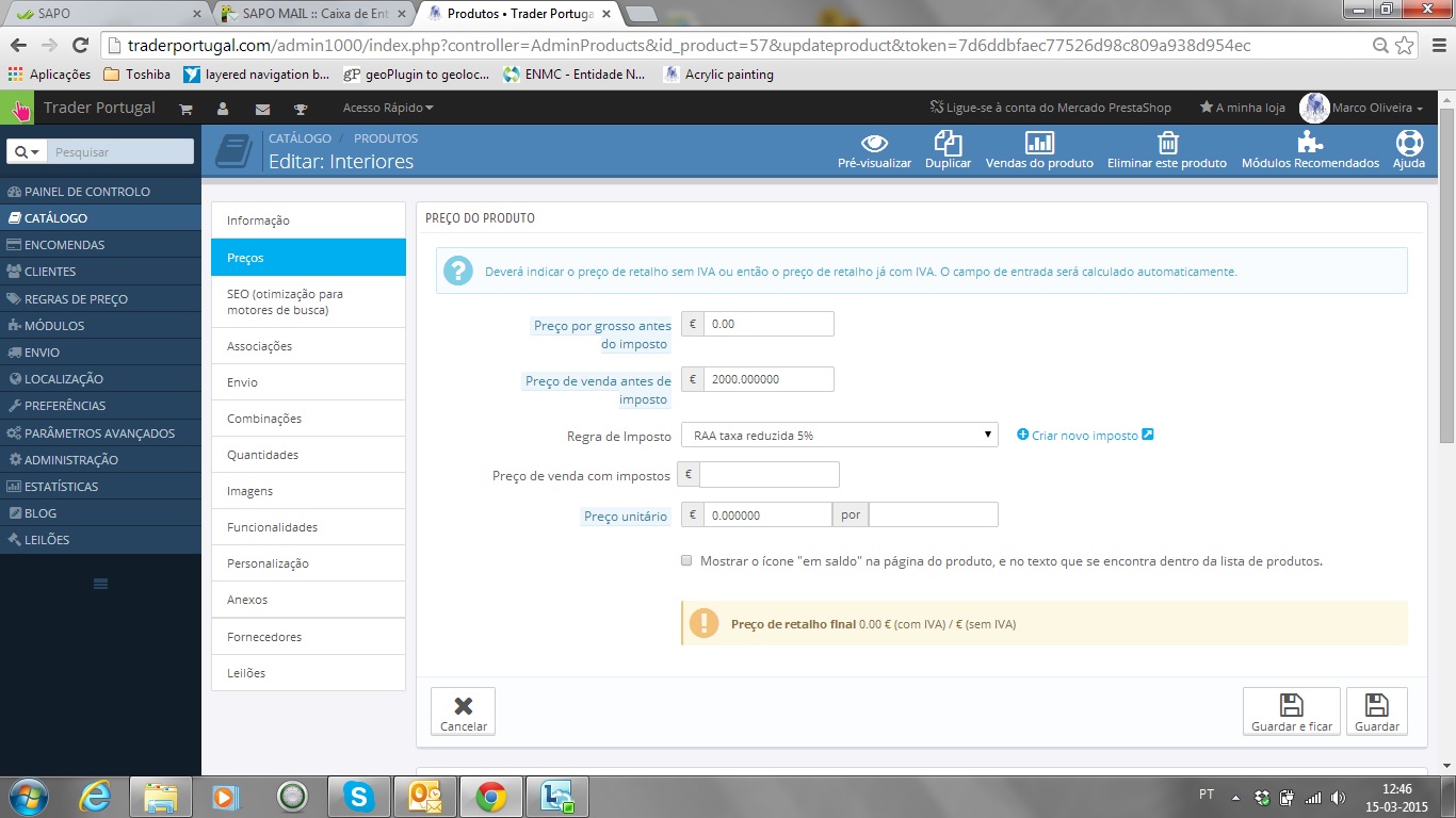 Marco Oliveira Posted March 15, 2015 Author Share Posted March 15, 2015 The lines are omitted in product site on back-office ? Add a screen of your problem, I cannot follow it. Did you made some code adaptations ? Installed non native modules ? If yes, undo and retry. EDIT: I tested on PS 1.6.0.11 and cannot confirm that there is any bug with taxes and prices not showing on back-office product page. Yes, i instaled multipleseller module wich is working fine after a lot of work of the developer. And its dificult to unistalled it. I cannot ugrade to 1.6.0.14 because a fatal error regarding to unistalle modules. Here is some pictures of the product interiores. Maybe if i substitute this file for the 16.0.11 native will solve the problem? If you think so, can you provide it to me? As you can see the product price are correct after saved but you dont see in the edition mode. In the website the price is correct to Thanks for your prompt reply Link to comment Share on other sites More sharing options...