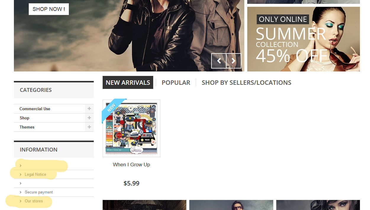 SGRANT Posted March 16, 2015 Share Posted March 16, 2015 Hello, I have the very latest version of prestashop, I did a clean install 3 days ago. My website address is: https://www.scrapbookuniverse.net/store/index.php I have the bootstrap theme. Please see attachments. On the left hand side it says INFORMATION. That's great, but I cannot find where to edit the (Legal, Our Stores, Secure Payment) Yes, as you can see, I looked at the back office under Preferences, CMS and they are not listed there the Legal, Our Stores, Secure Payment. Question where do I find those pages (the Legal, Our Stores, Secure Payment) so I can delete them? Thank you so much. Sharon Link to comment Share on other sites More sharing options...