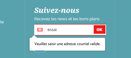 Mary26 Posted March 16, 2015 Share Posted March 16, 2015 hello,I would like to bring up a bubble message in the newsletter block if the email address is not correct in the place of " newsletter : Invalid email address " in a new page.See the 2 images for more understandingPrestashop 1.6Thank you for your help. First image that I try to do , Second image, what I have on my site Link to comment Share on other sites More sharing options...