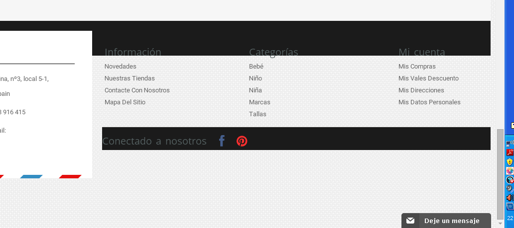 chis Posted March 19, 2015 Author Share Posted March 19, 2015 Si usas una plantilla comprada, deberás tener un fichero llamado global.css o similar. Con cuidado lo abres con el notepad++ (por ejemplo), no sin antes hacer una copia del fichero global.css .Busca FOOTER, apareceran unos cuantos, sólo debes modificar el que veas que es el pie de página, debe poner justo debajo de footer: "background-color:" Te estamos ayudando a ciegas, nos gustaría ayudarte mejor, pero sin ver el css no te puedo decir nada más. Ok. Vuelvo a abrir la web. Es que no quería dejarla demasiado tiempo abierta. Muchas gracias! Link to comment Share on other sites More sharing options...
