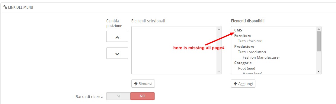 hife Posted March 19, 2015 Share Posted March 19, 2015 (edited) In the module "Top Orizontal Menù" if I click "edit" there are no CMS categories and no pages of course (see img attached) is displayed in the box for selection. (so it's impossible to select any CMS content) It's a new installation, prestashop 1.6.0.13, only changed language and few settings.theme is default one. I already tried: to change to previuos language to reset and to re-install the module to create new contents and new categories on CMS to disable and re enable all contents (pages) to check for visibility setting (debug mode is enabled, but no message is showing ) Any idea? thank you this is the II problem (1° was White page in hook configuration page) without touch anything from the installation, it's normal to have these kind of problems with prestashop ? Thank you very much for any suggestion Edited March 19, 2015 by hife (see edit history) Link to comment Share on other sites More sharing options...