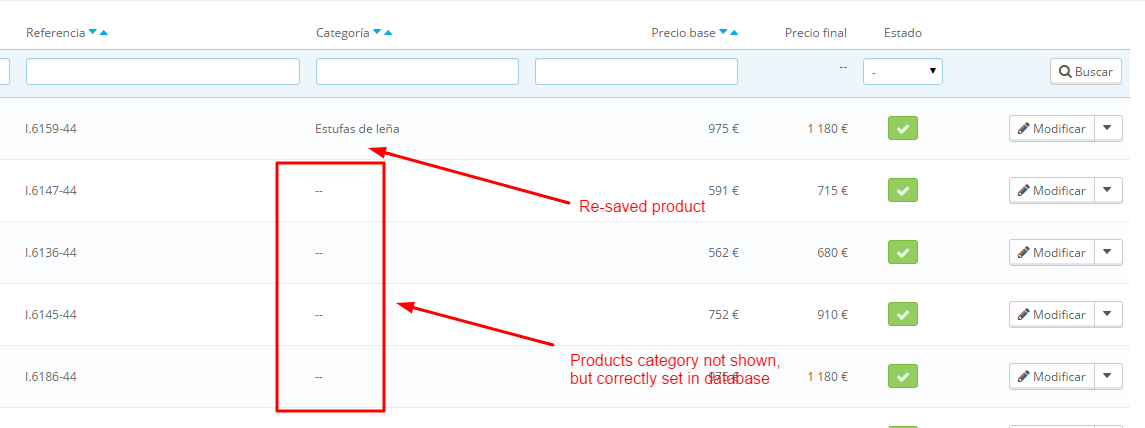 demlasjr Posted March 22, 2015 Share Posted March 22, 2015 Hello everyone! I have a problem: I used cart2cart to migrate products from virtuemart to prestashop. Everything went okay, but now, on Products page, every product is displayed without category. I checked the database and every product have the correct category set. If I open inside prestashop the product in order to edit it, I see it's category and after re-saving, the product category is displayed on Products Page (as seen in attached printscreen) Any way to fix this issue? Thank you. Kind regards, Laszlo Link to comment Share on other sites More sharing options...